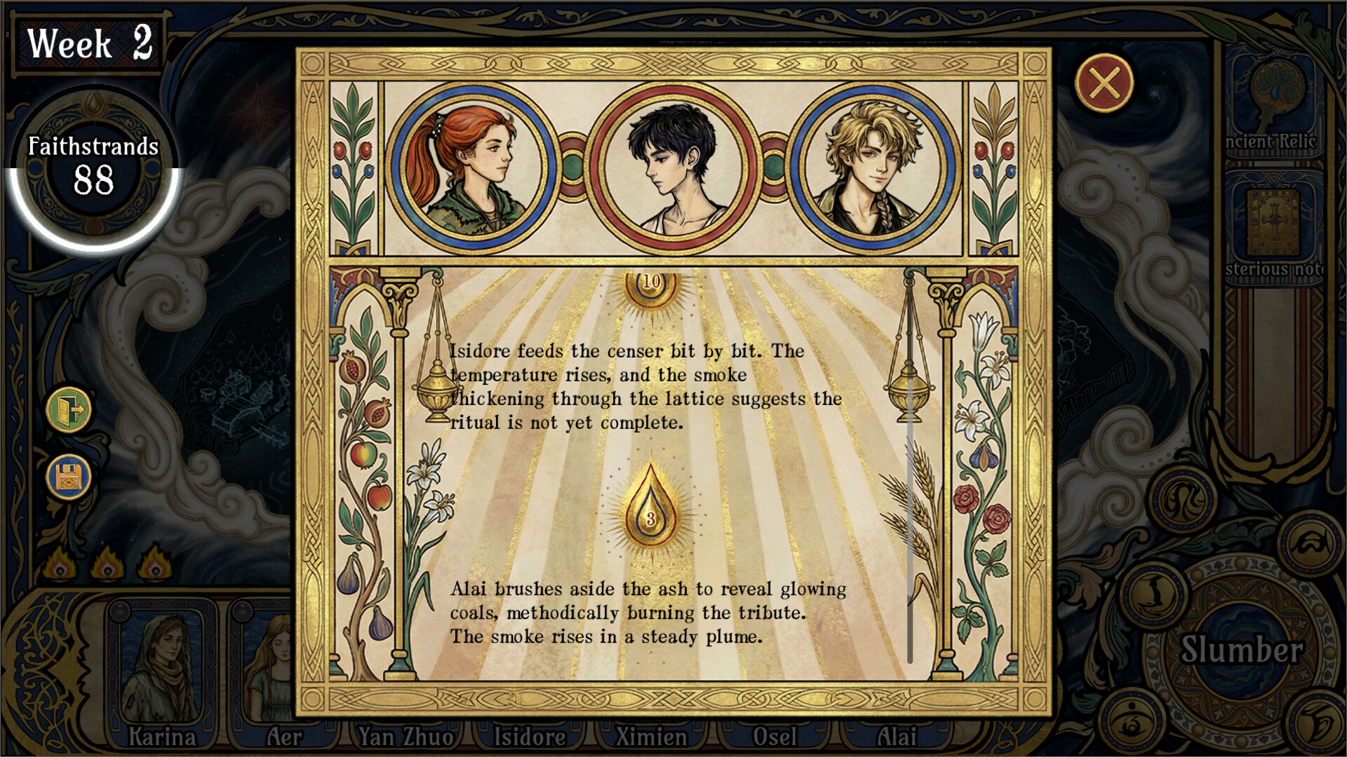 The cosmos and all of nature have always lain hidden deep within your Primal Consciousness — in your weakened state, is there truly a boundary between you and the omniscient ancient rulers? In moments of revelation, the once-unhindered wisdom and laws grant you the chance to touch them again. When the Crimson Star aligns, you can choose a Believer to undertake a Spirit Walk on your behalf, bringing back ancient tomes, bizarre artifacts, withered roots of the World Tree, and the Divine Laws you already possessed but had forgotten.