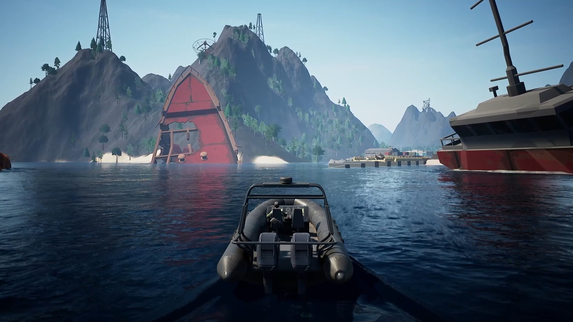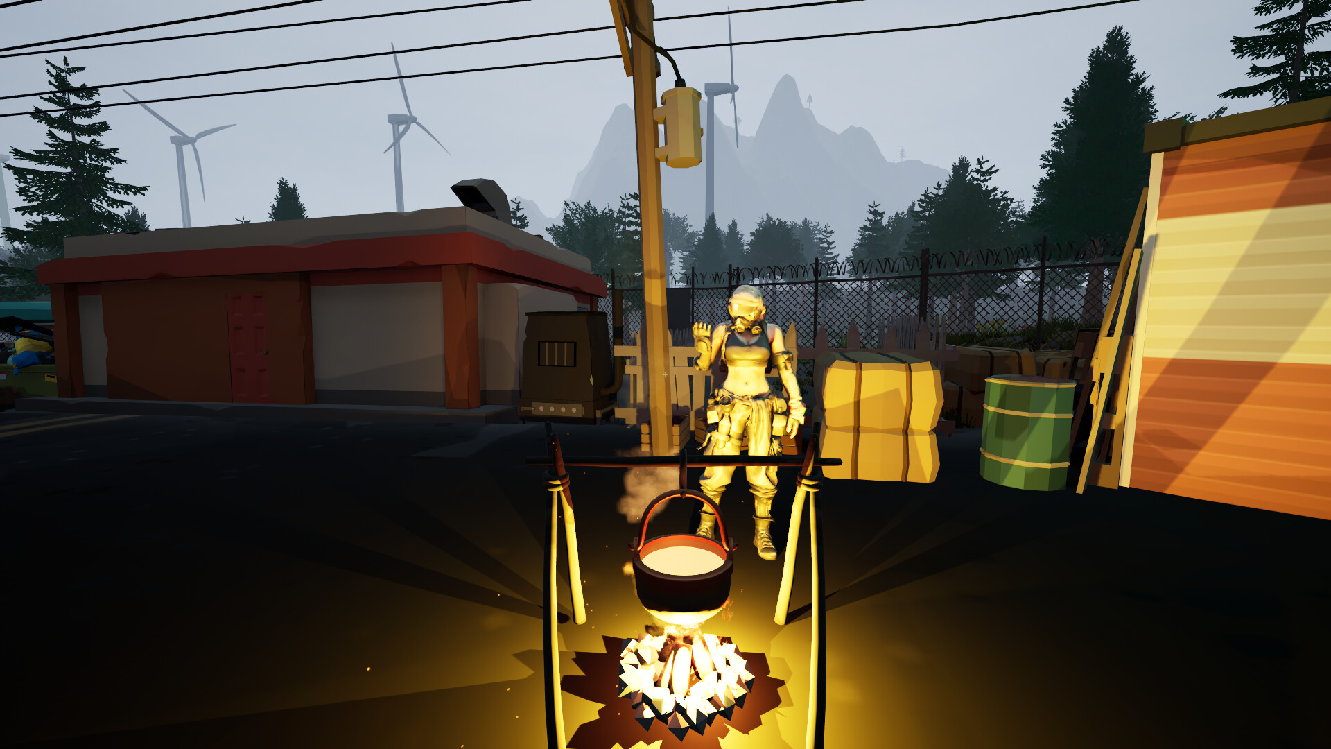 Explore a large stylized open world featuring survivor camps, factories, farms, abandoned towns, wilderness areas, and various dangerous points of interest (POIs).