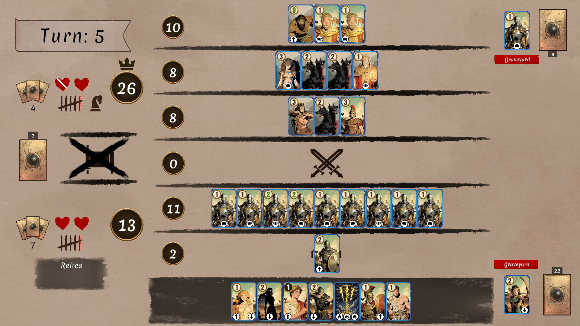 Build your deck from a wide range of mythological heroes, gods, and creatures. Each battle is a test of strategy — place your cards wisely, combine powerful abilities, and adapt to your opponent’s moves to gain the upper hand.