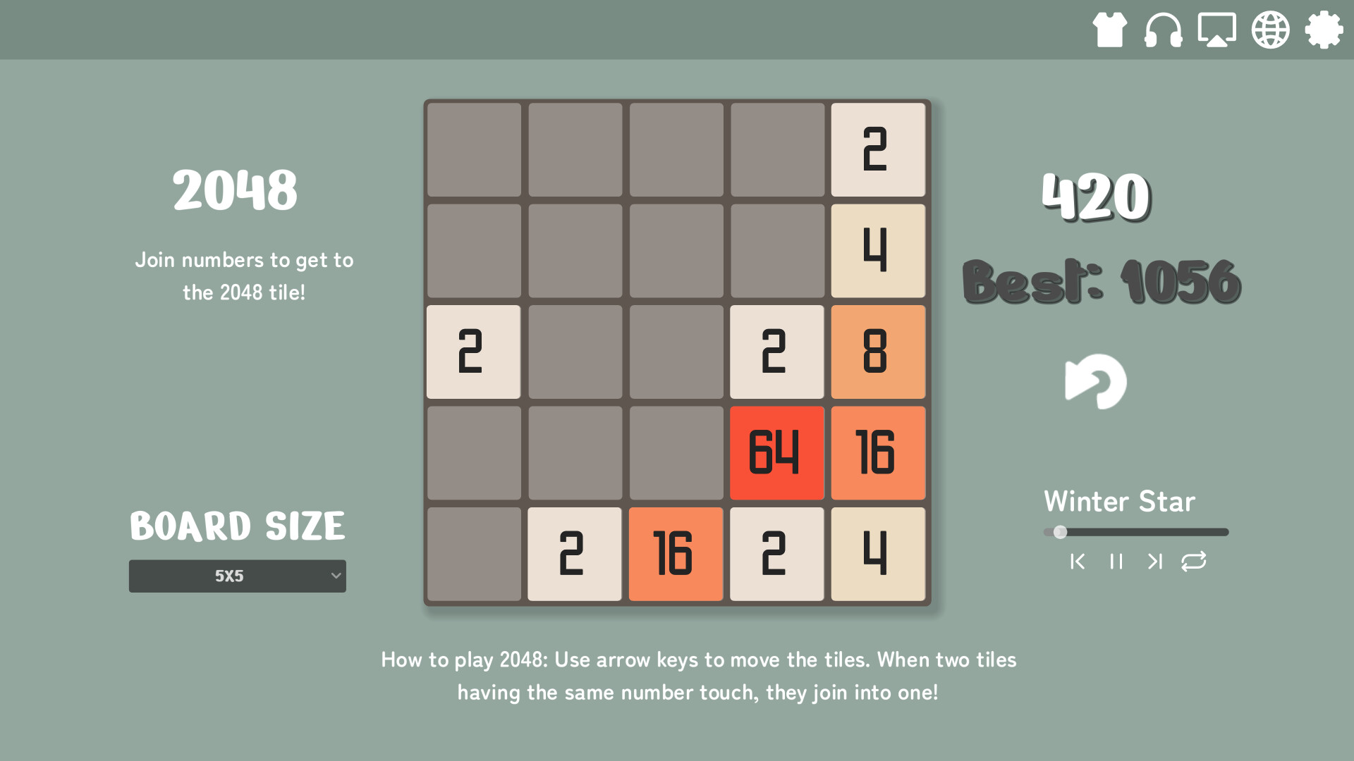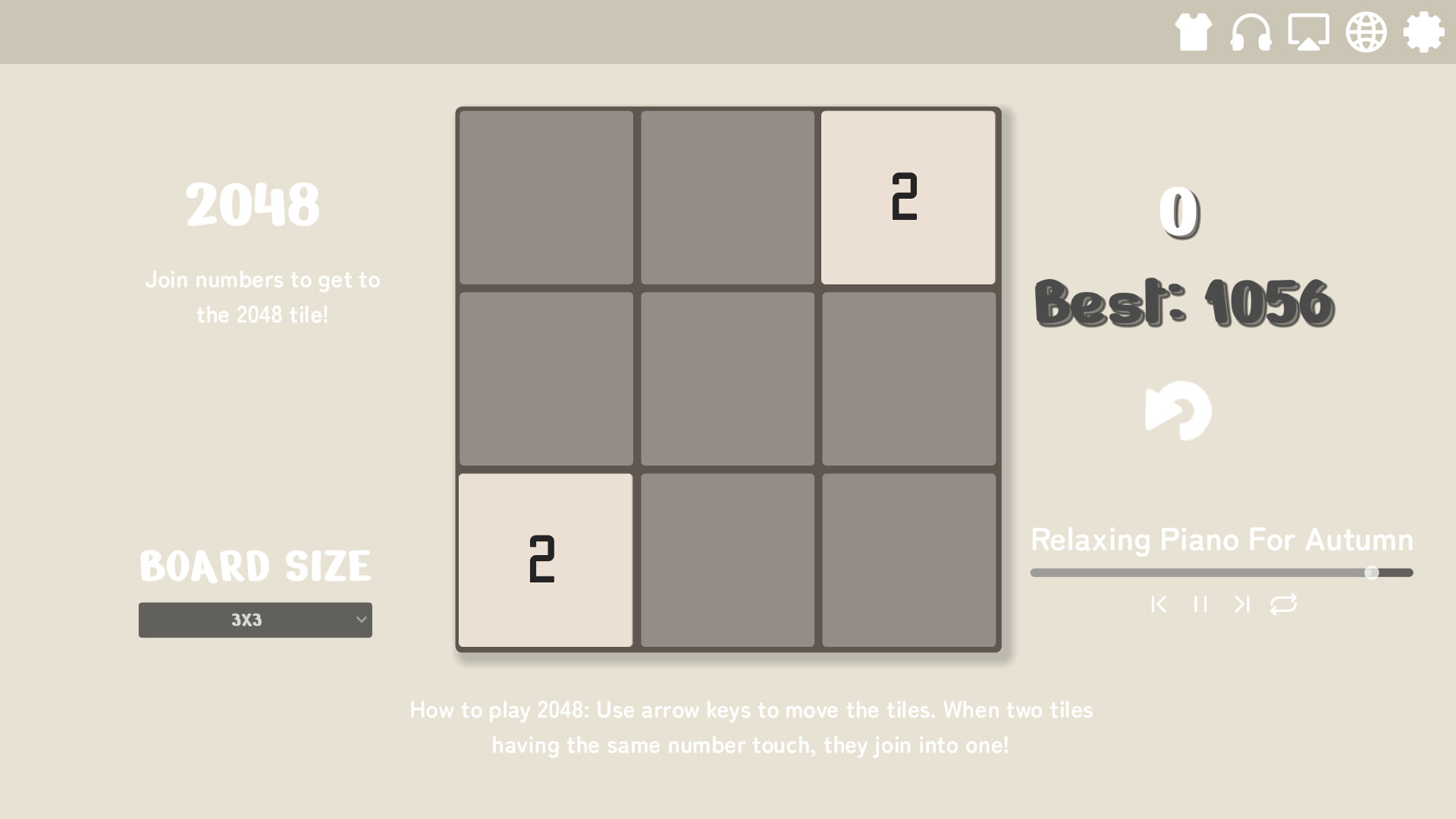 방향키(또는 WASD)로 숫자 타일을 밀어서 이동시키고, 같은 숫자끼리 부딪히면 합계 숫자로 합쳐집니다(모든 숫자는 2의 거듭제곱). 이동할 때마다 2 또는 4 타일이 무작위로 생성됩니다. 2048 타일을 만들면 기본 클리어이며, 더 높은 숫자를 계속 도전할 수 있습니다. 판이 꽉 차 더 이상 합칠 수 없을 때 게임이 종료되며, 전략적 배치로 최고 점수를 목표로 합니다.