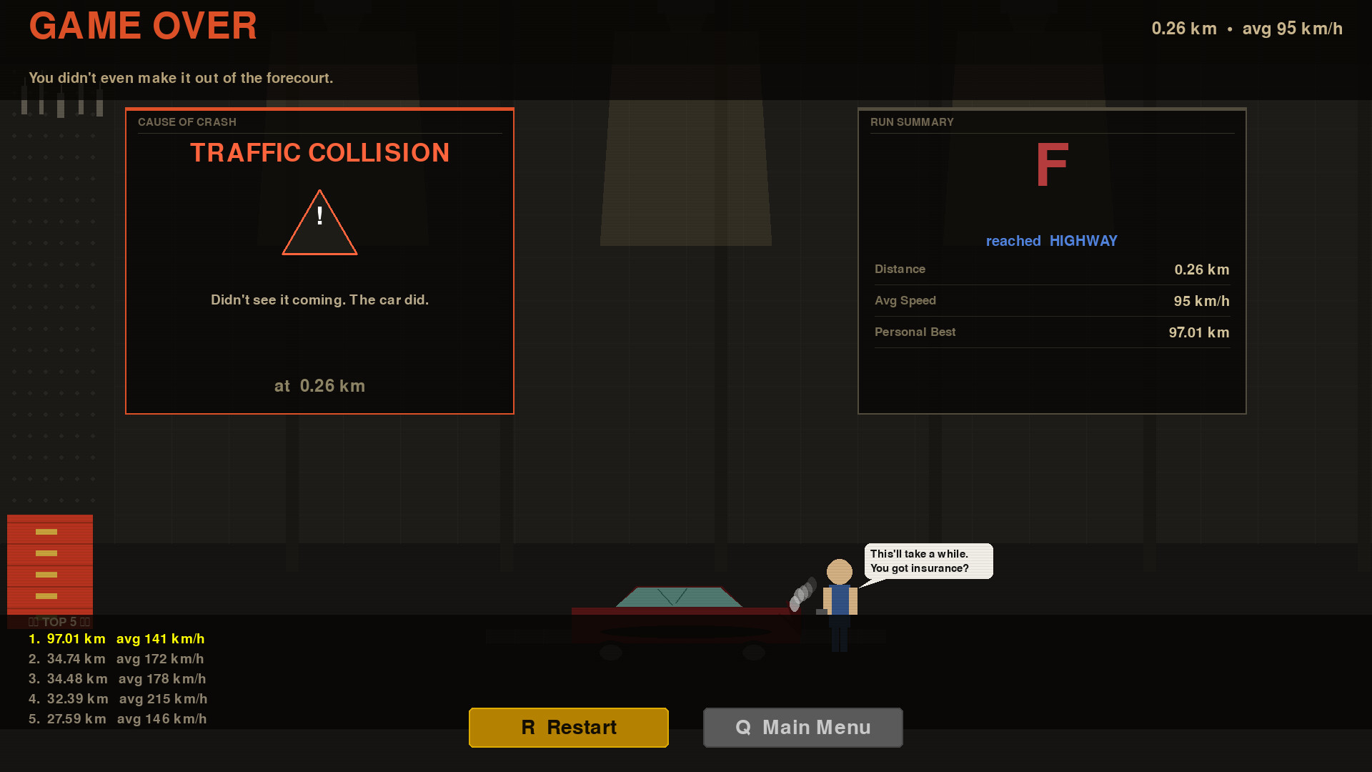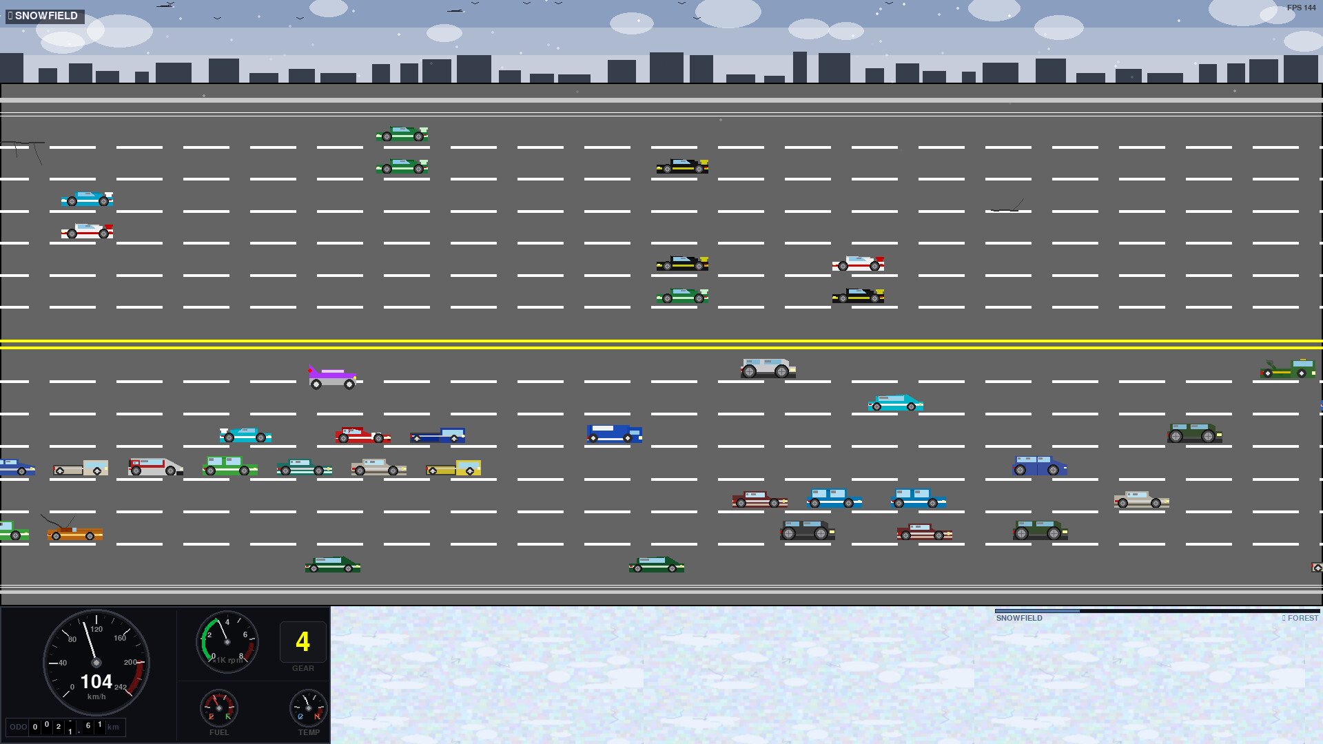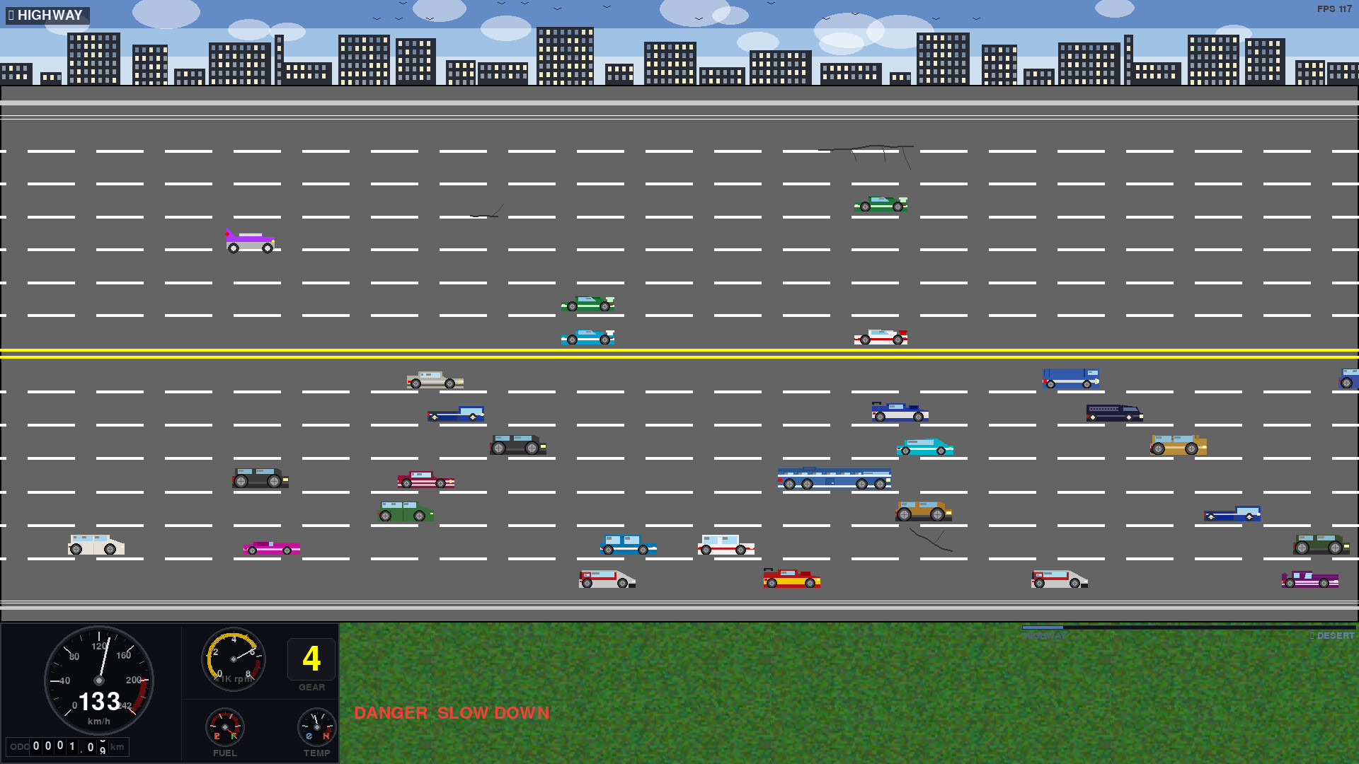 The rules are simple: stay on the road, avoid the obstacles, reach Vegas at 100km. What makes it hard isn't the traffic — it's the texts and your patience. If you wanna go faster, nothing is stopping you. Just like the real world highway, if you drive faster you are just increasing your risk. You can take your time but the best approach is to stay with the flow of traffic. Manage your speed, attention and Fuel gage.