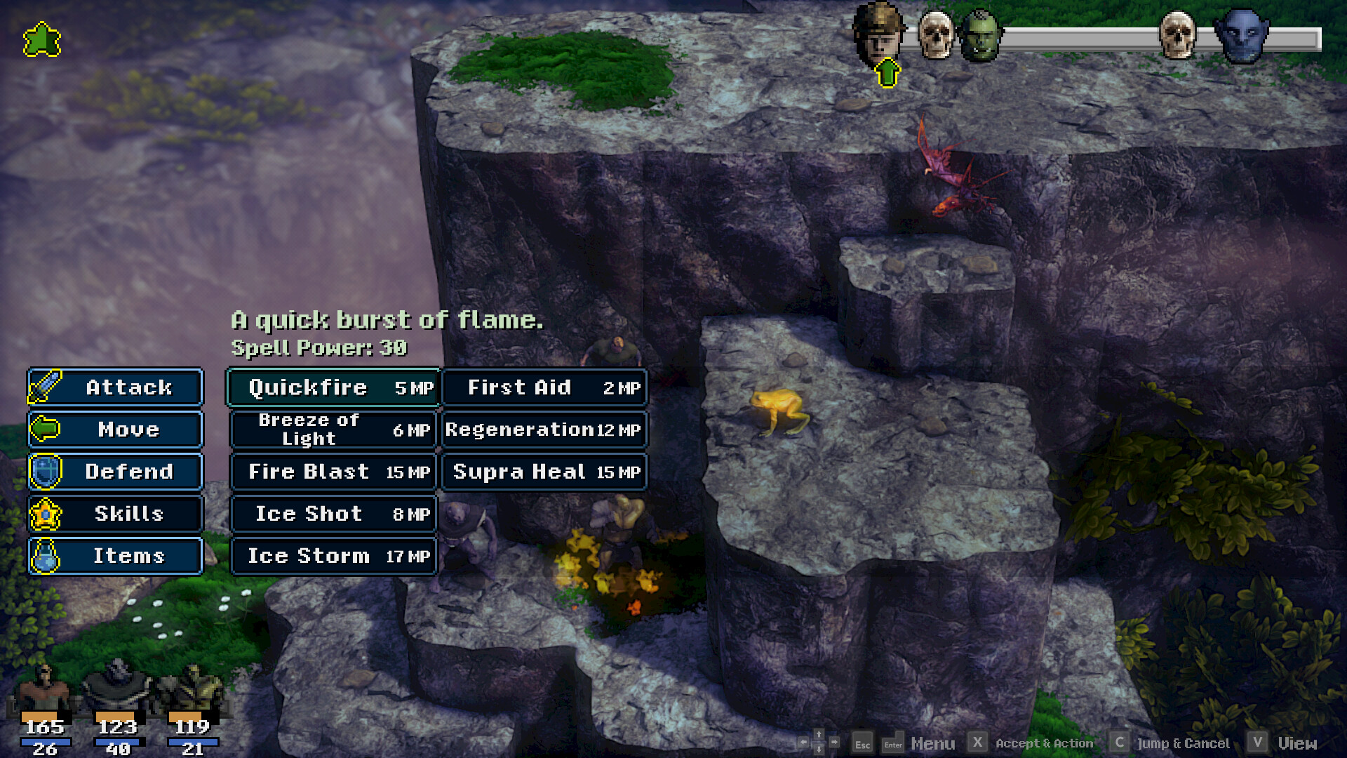 Hit enemy weaknesses to gain additional turns and to delay their next turn. Placement matters -- spread out, get behind enemies, attack from above. Use elemental attacks and weapon types to your advantage.