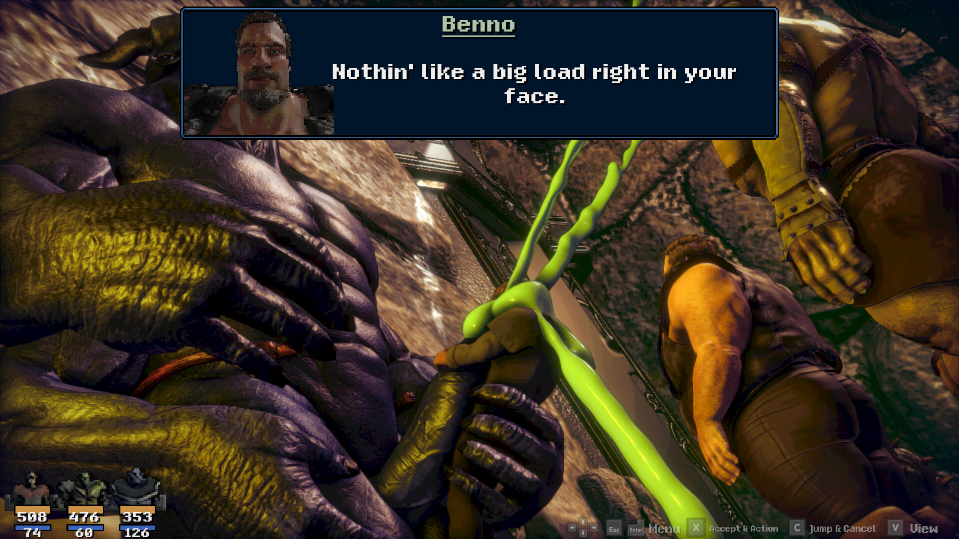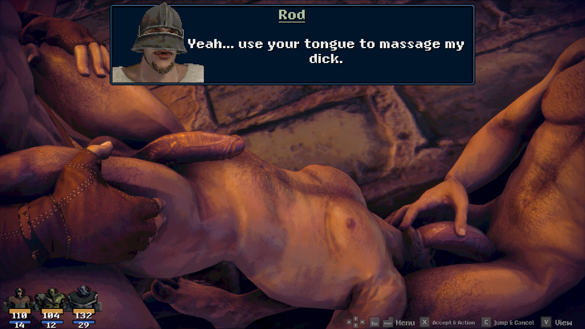 Exploration pays off -- treasures, equipment and useful items as well as new allies are waiting to be found. Some of the big fellas you meet may also want to have some fun with you. Pleasure them and grow stronger!