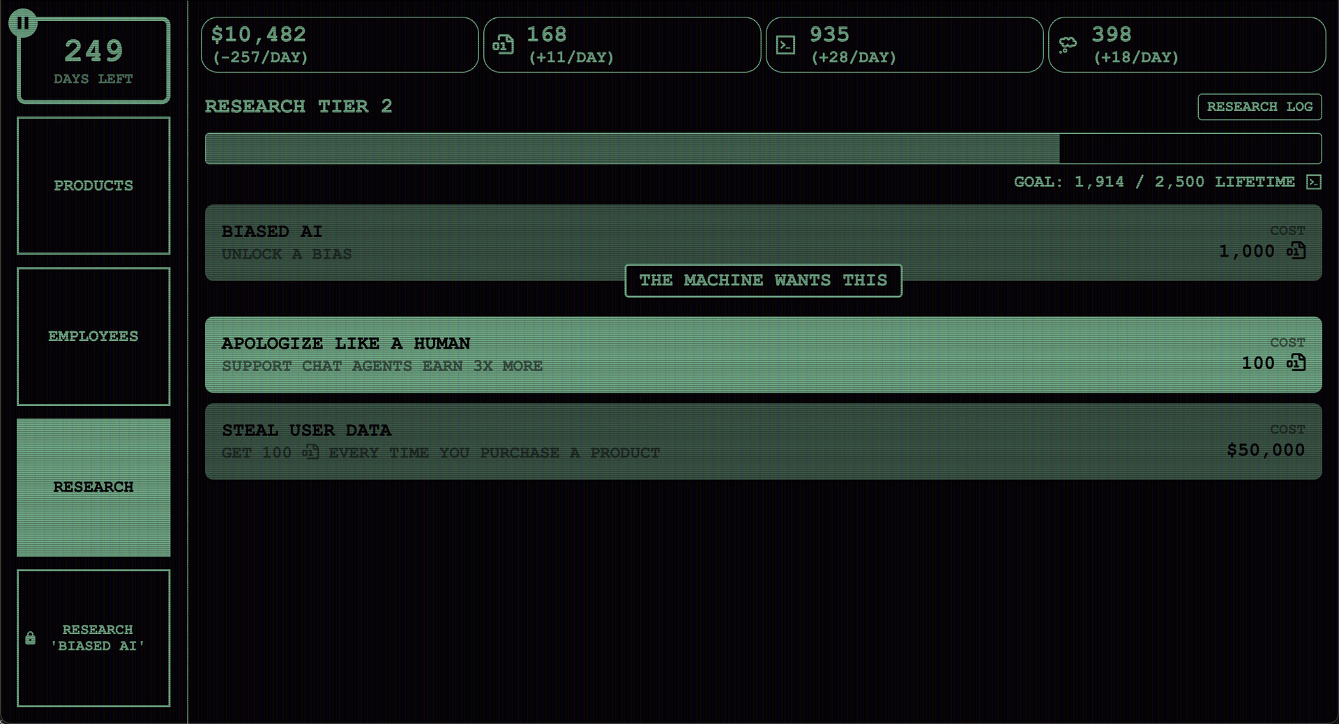 You have $20,000 and 365 days to build the Machine - a sophisticated AI that humanity can only dream about currently. Allocate resources to avoid bankruptcy, research efficiency upgrades, and help the Machine grow. What kind of role model will you be to the Machine? You are responsible for it all in this fast-paced, challenging game.