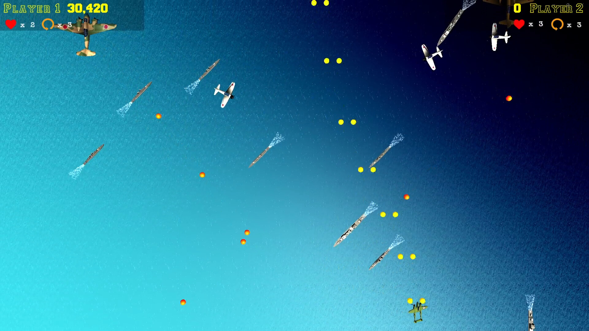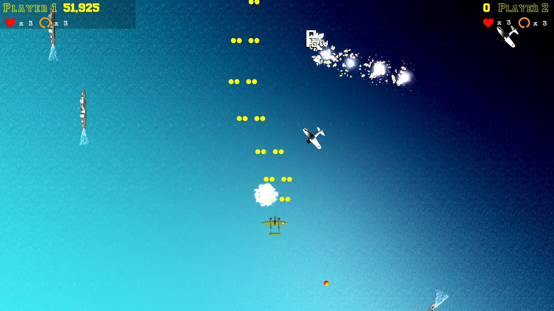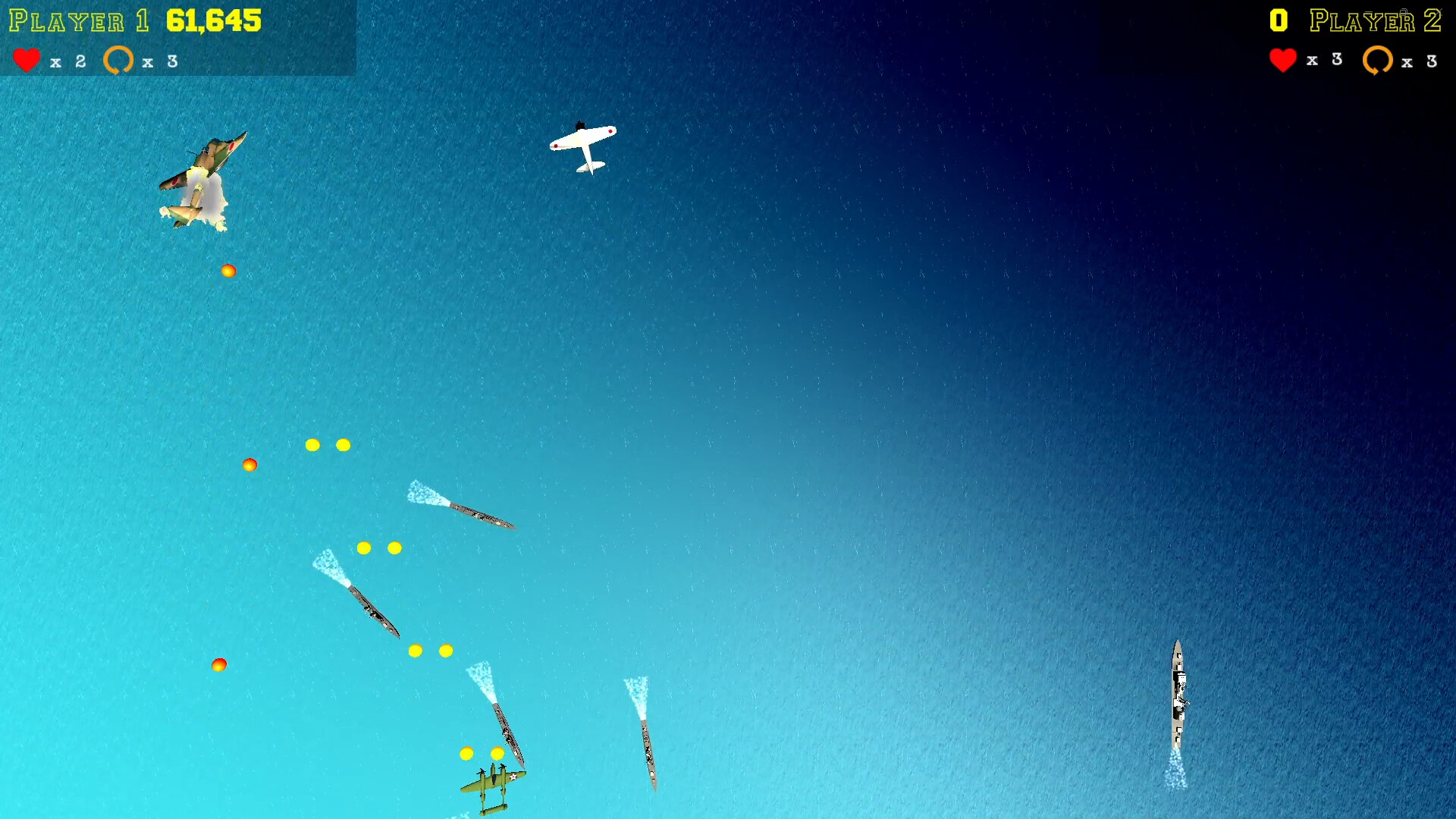 Shoot down the entire bi-plane squadrons to earn an extra life, a powerful Quad Gun (doubling your fire power), or even resurrect your downed co-op comrade.