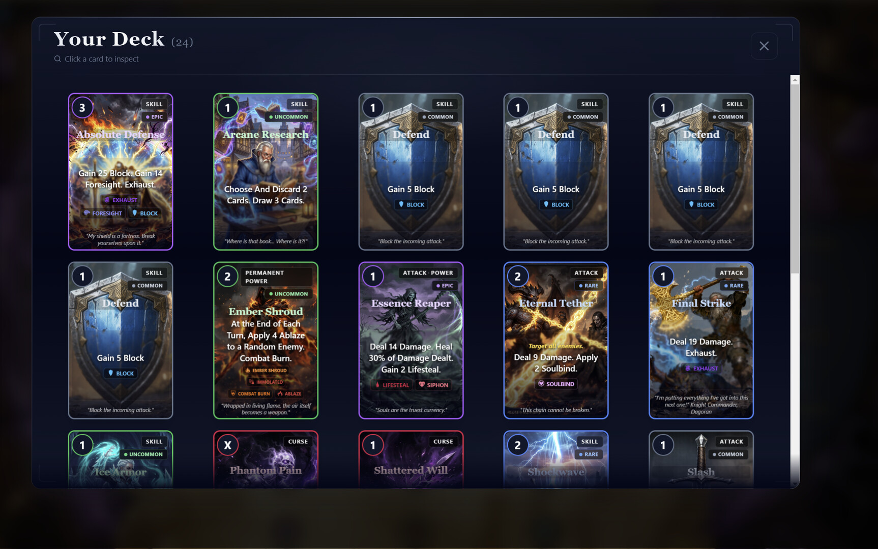 Every card features deliberate mechanical design. From setting up devastating strikes and elemental statuses to creating impenetrabl barriers and defenses to survive each turn. Build synergies across attack, skill, and power archetypes. Cards can become greater and more powerful through various choices on your journey.