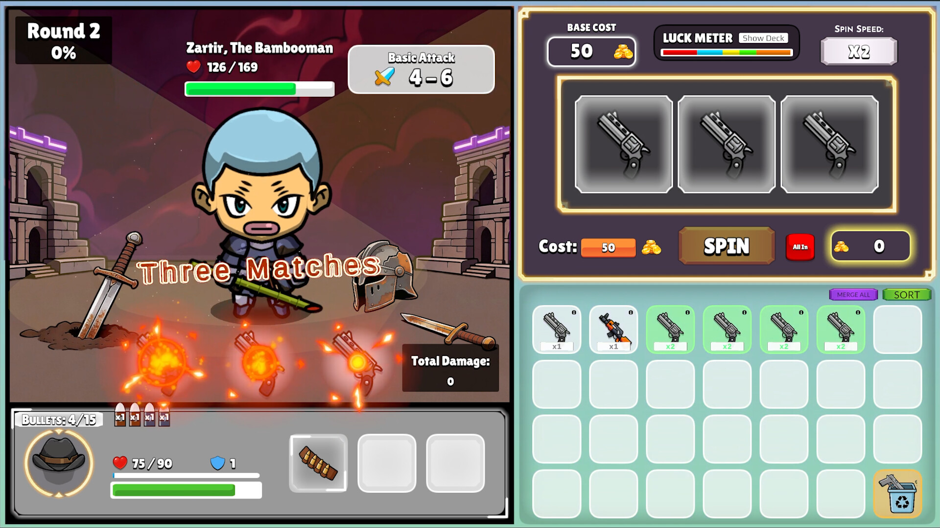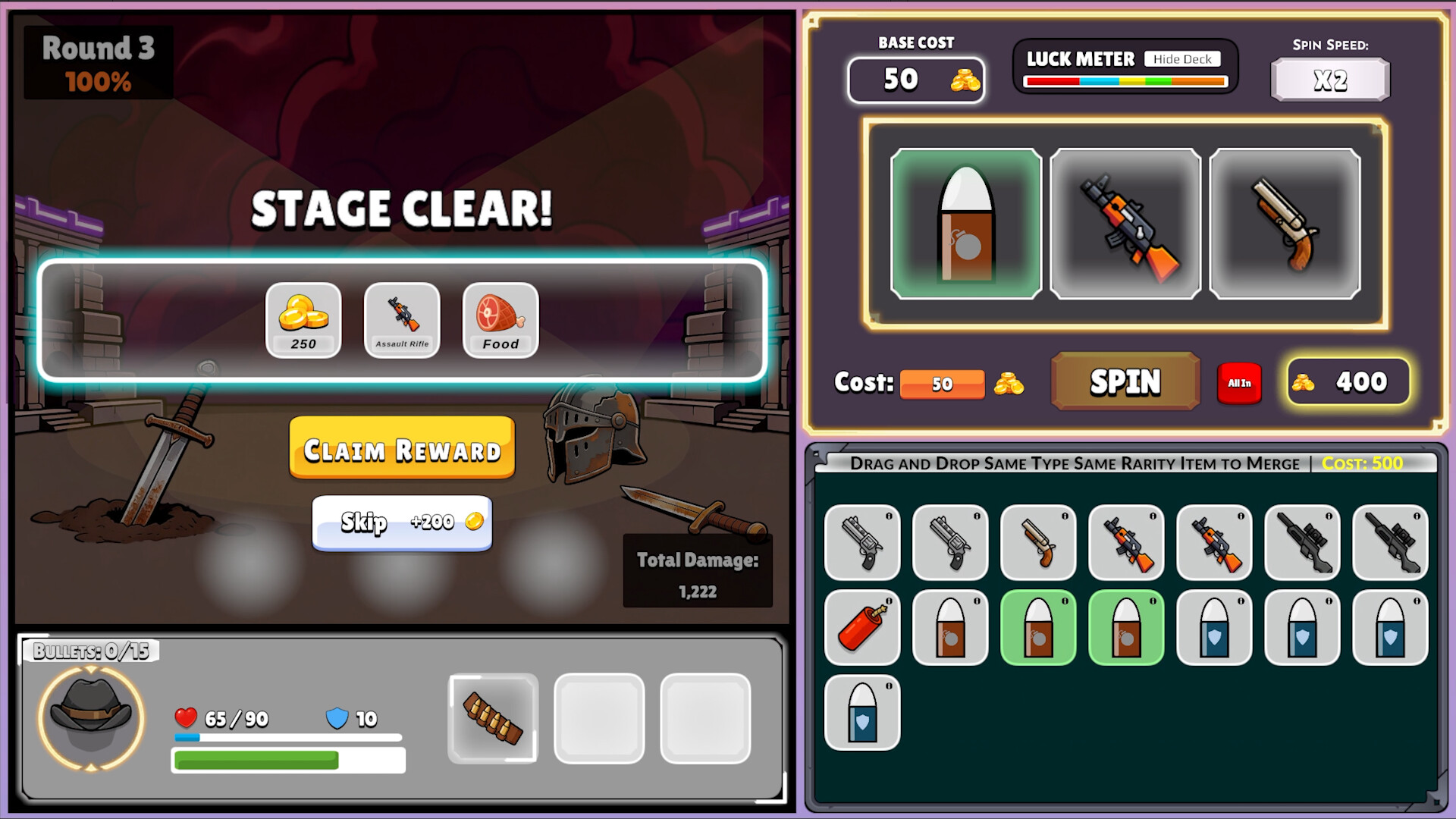 BUILD YOUR MACHINE (DECKBUILDING EVOLVED) Every time you survive a wave, you draft new symbols to add to your reels. Will you build a heavy-hitting revolver build, a gold-generating economy engine, or a magical fruit combo? The synergies are completely up to you.
