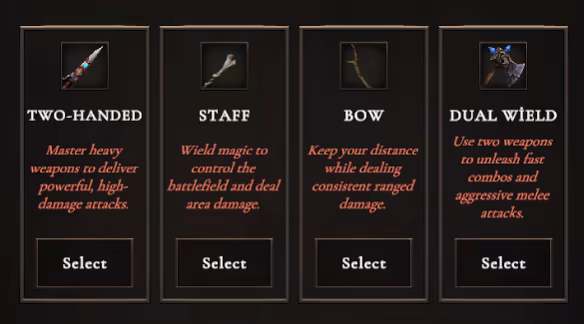 양손 무기, 이중 무기, 지팡이, 활 — 완전히 다른 플레이 스타일.