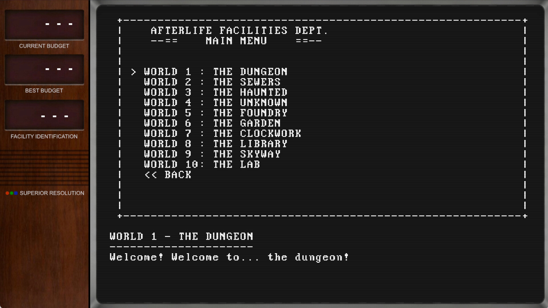 Afterlife Facilities Department (AFD) is a platformer that fits entirely on one screen. Every level is a compact playground of teleporters, quirky machines, and just enough hazards to keep your reflexes sharp—but not your blood pressure.