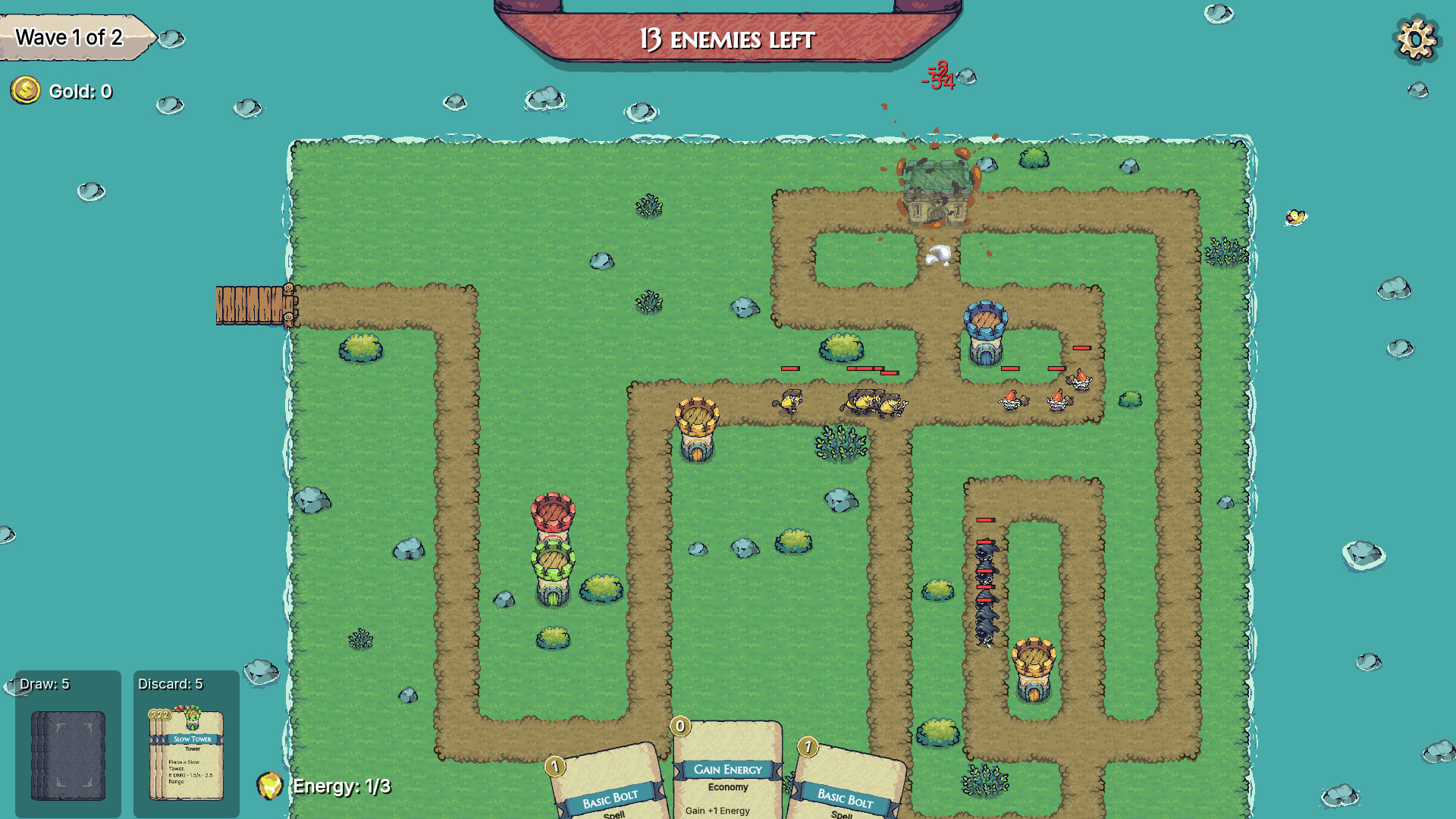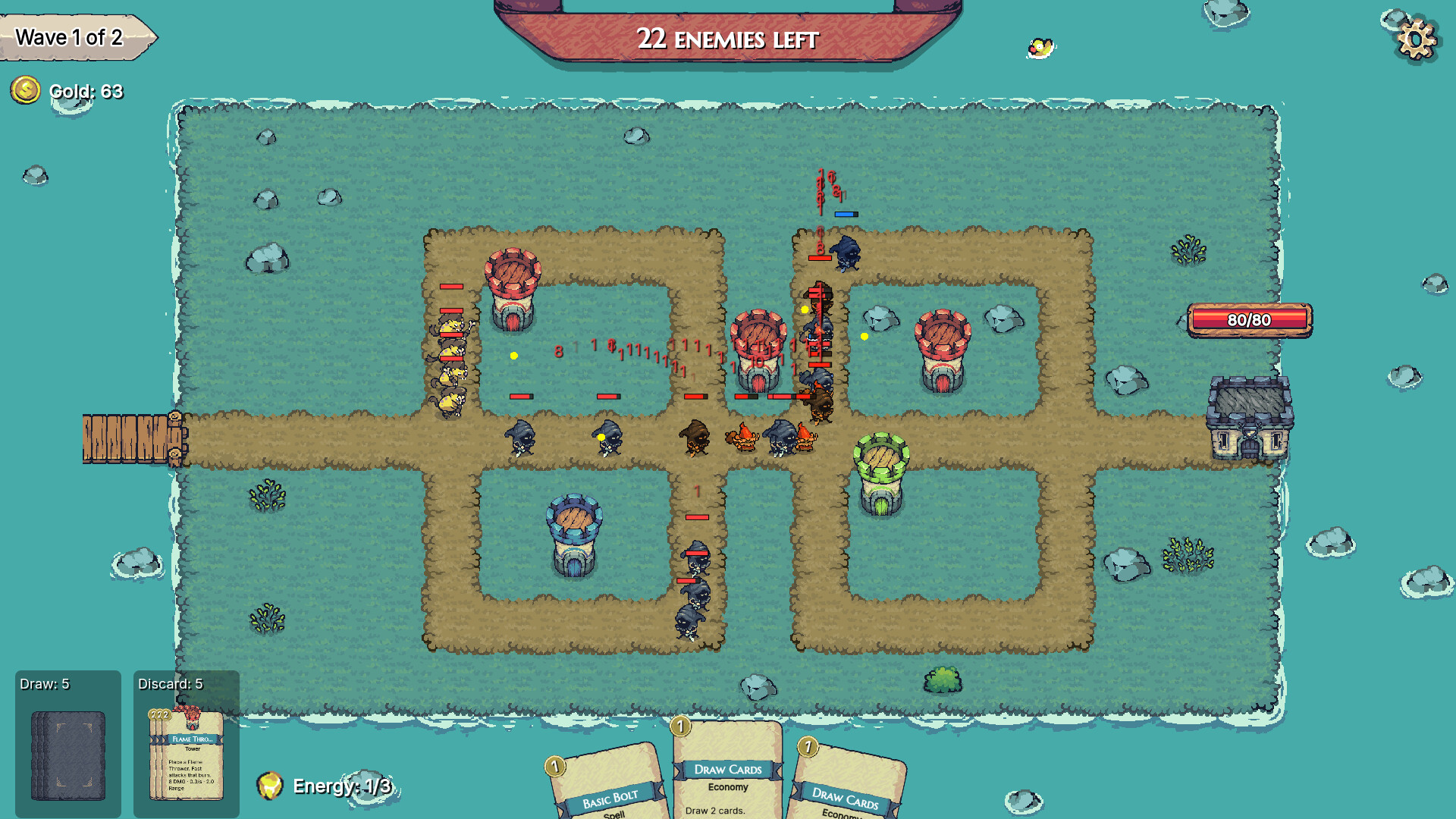 Build your defense with cards: turrets, spells, upgrades, and utility tools all come from your deck