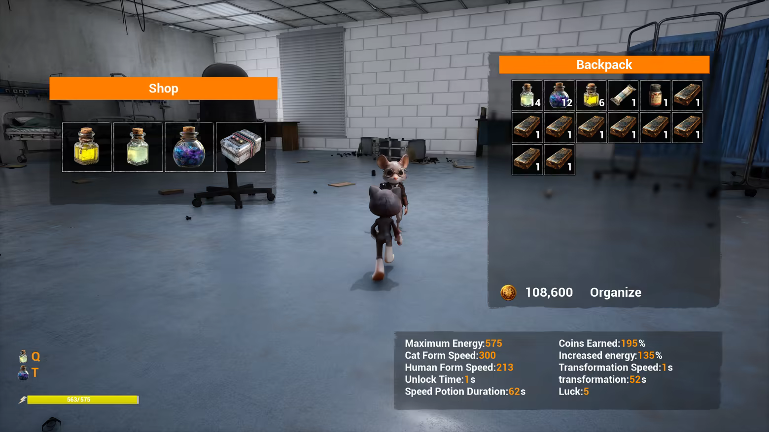 Buy items and various power-ups! Use these power-ups to increase your chances of survival. There are four types of power-ups in total: Energy Potion, Speed Potion, Transformation Potion, and Bomb.