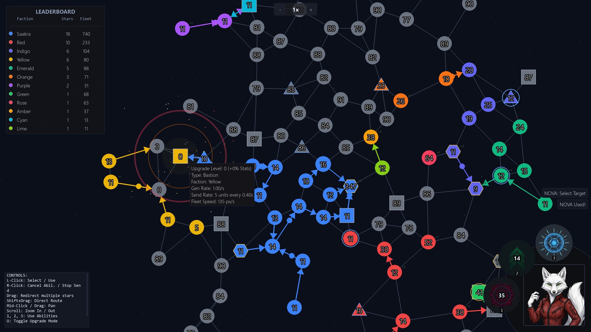 The battlefield is a web of celestial nodes, each generating fleets to fuel your war machine. But you cannot simply attack anywhere. You must work with the physical topology of the galaxy or manipulate it to your whim using special commander abilities to create or cut off supply chains!