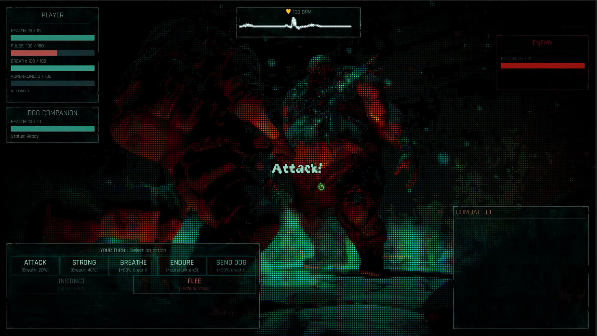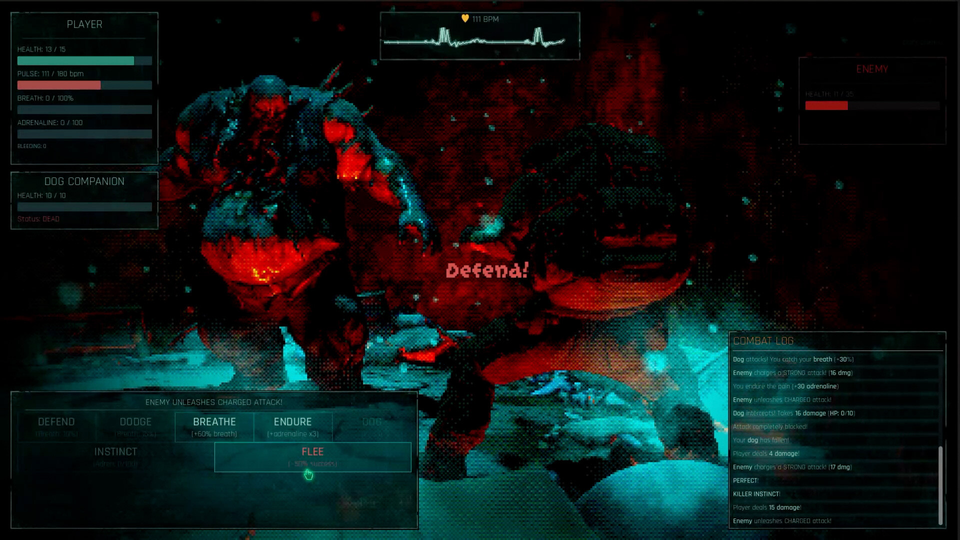 Combat that feels like panic, not power. Real-time pulse and breathing mechanics. Your hands shake. Your vision narrows. Winning a fight doesn't feel heroic. It feels like you almost died. The moral choice after combat is often worse than the fight itself.