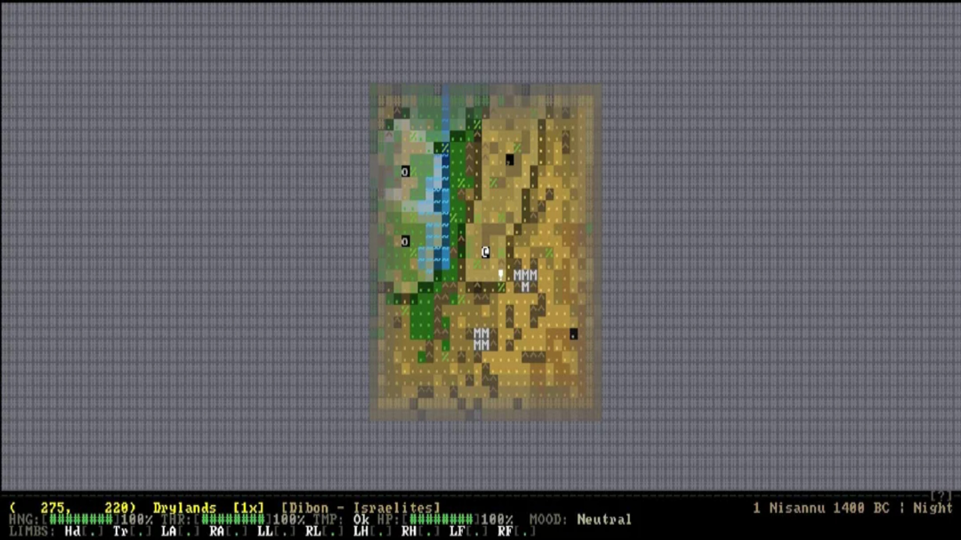 You are mortal. Hunger and thirst are constant pressures. Forage open terrain for food, drink from rivers, camp to recover health, and manage your inventory across long journeys. Wounds require medicine. Pack animals extend your carrying capacity. Every decision about where to stop, when to rest, and what to carry has weight.