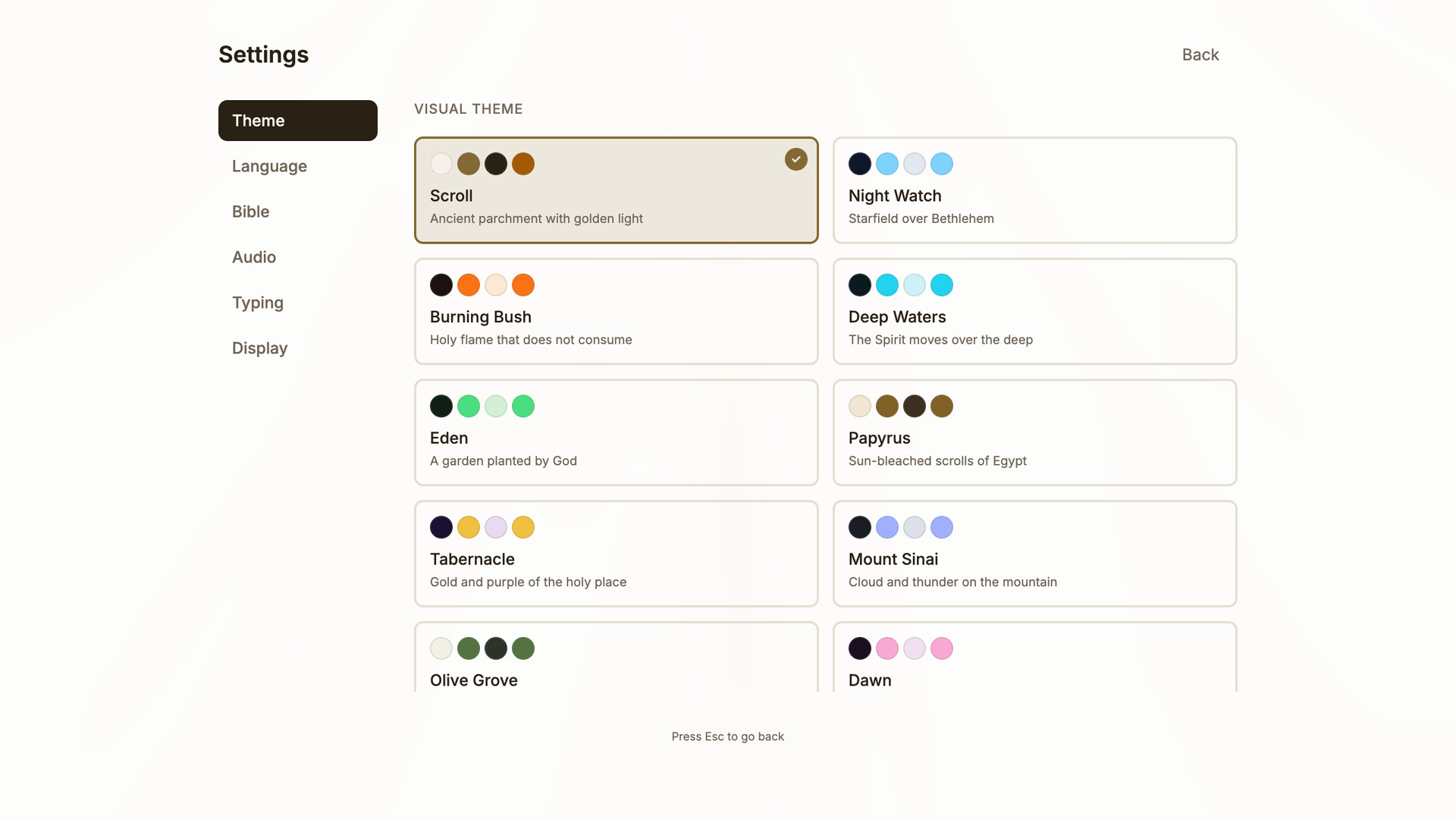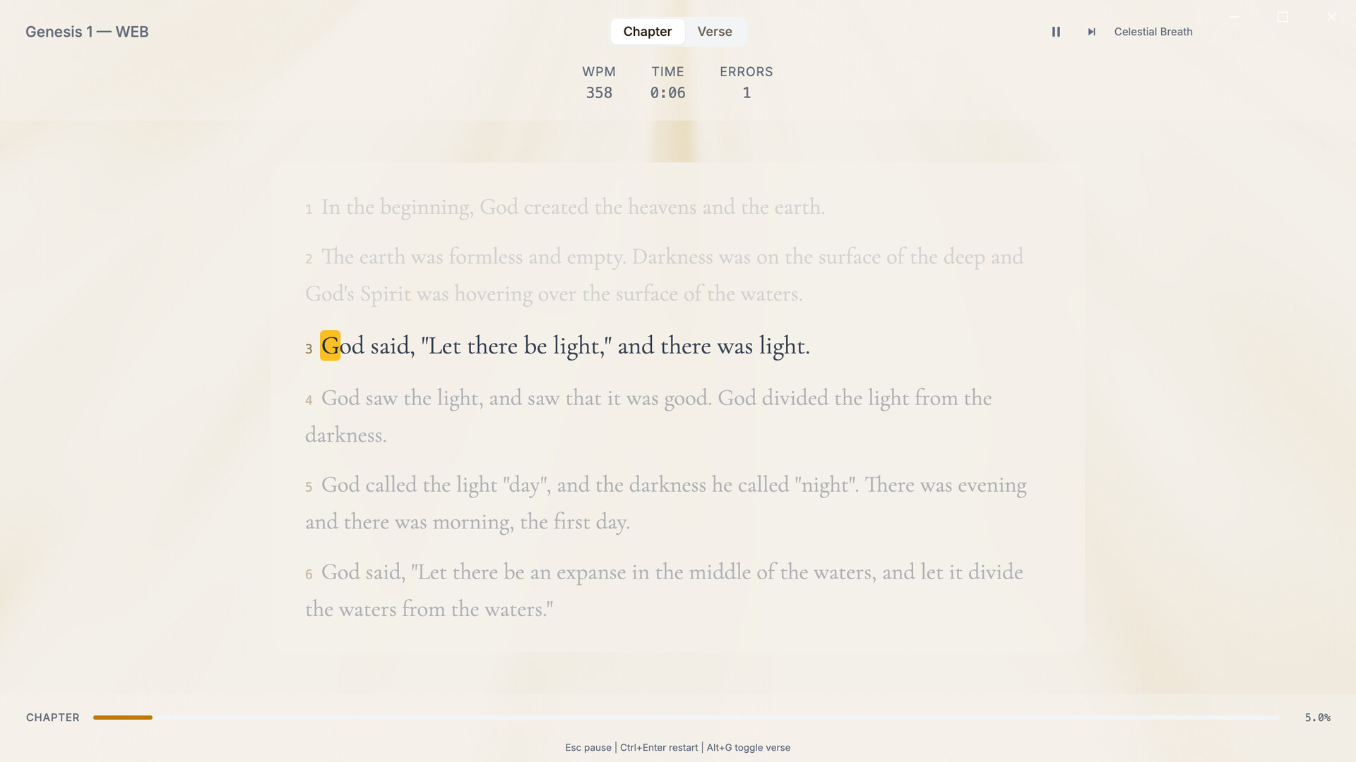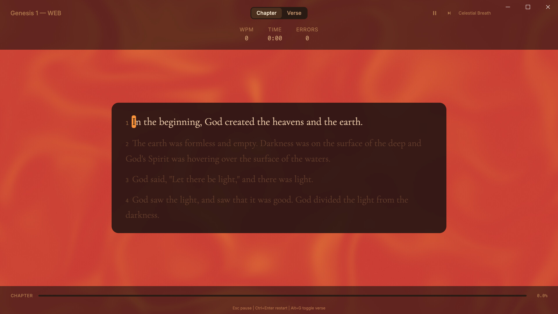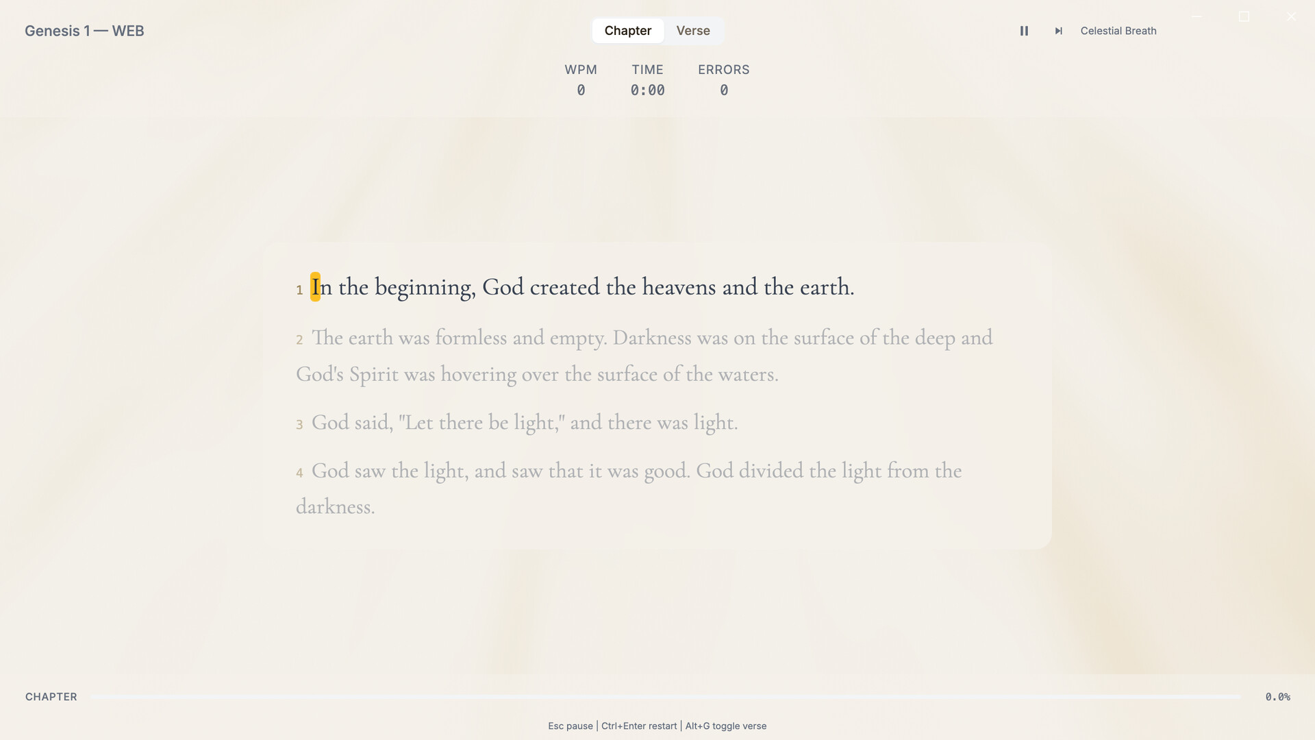 화면에 나타나는 성경 구절을 따라 타이핑하세요. 보이는 대로 입력하면 됩니다. 오류는 빨간색으로 표시되고, 올바른 키 입력으로 커서가 앞으로 이동합니다. 장을 완료하면 통계가 저장되고 다음 장이 잠금 해제됩니다. 언제든 멈춘 곳에서 다시 시작할 수 있습니다.