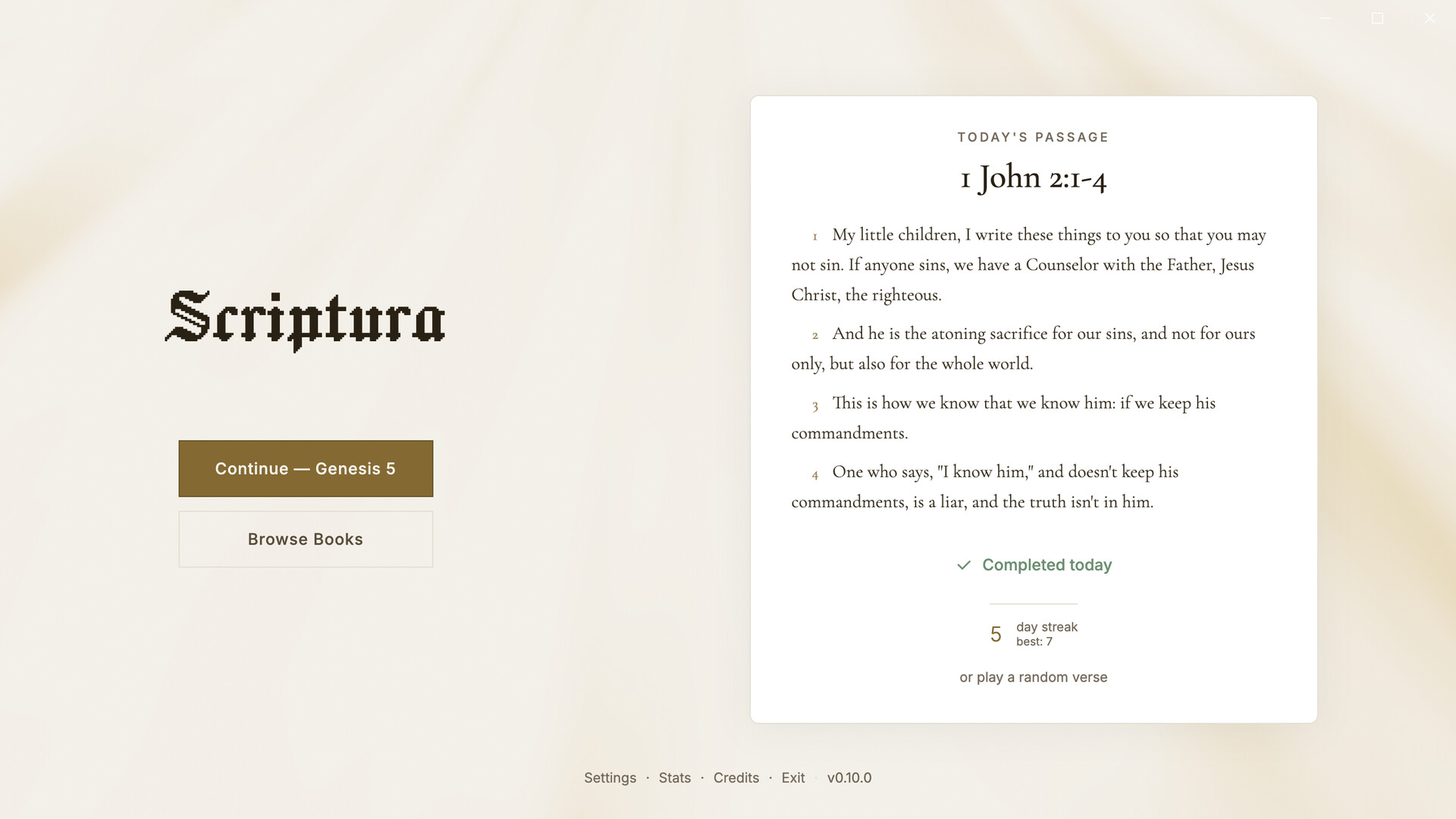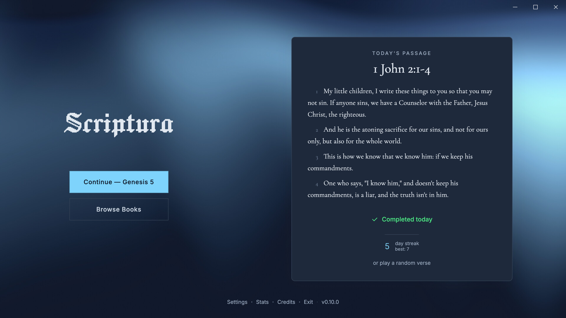 Scriptura는 성경 타이핑 게임입니다. 창세기부터 요한계시록까지 모든 장을 절마다, 단어마다, 글자마다 타이핑합니다.