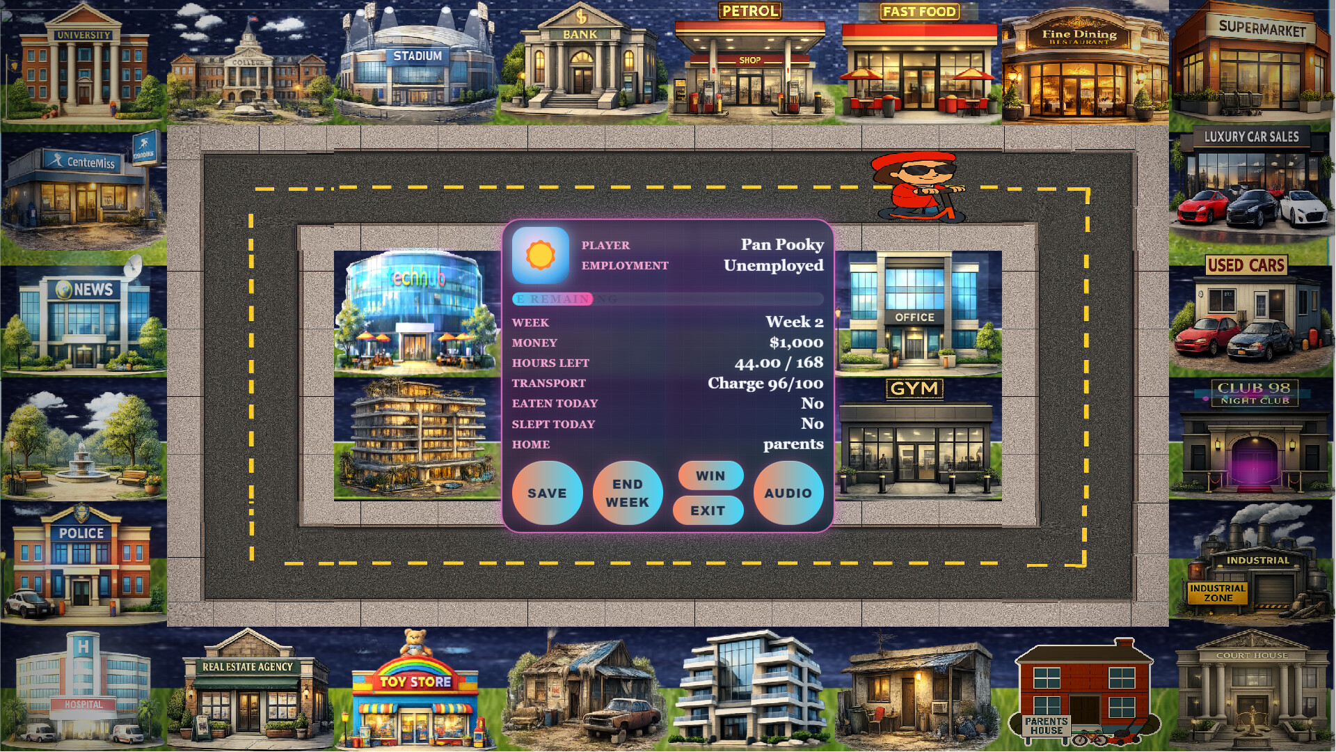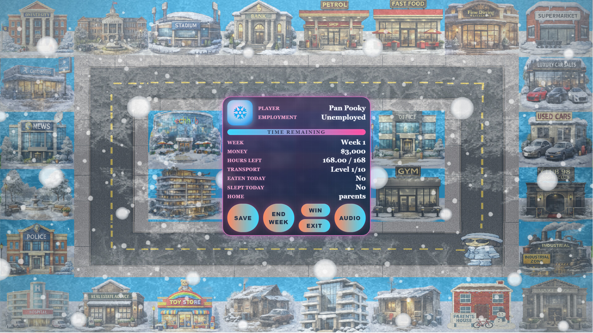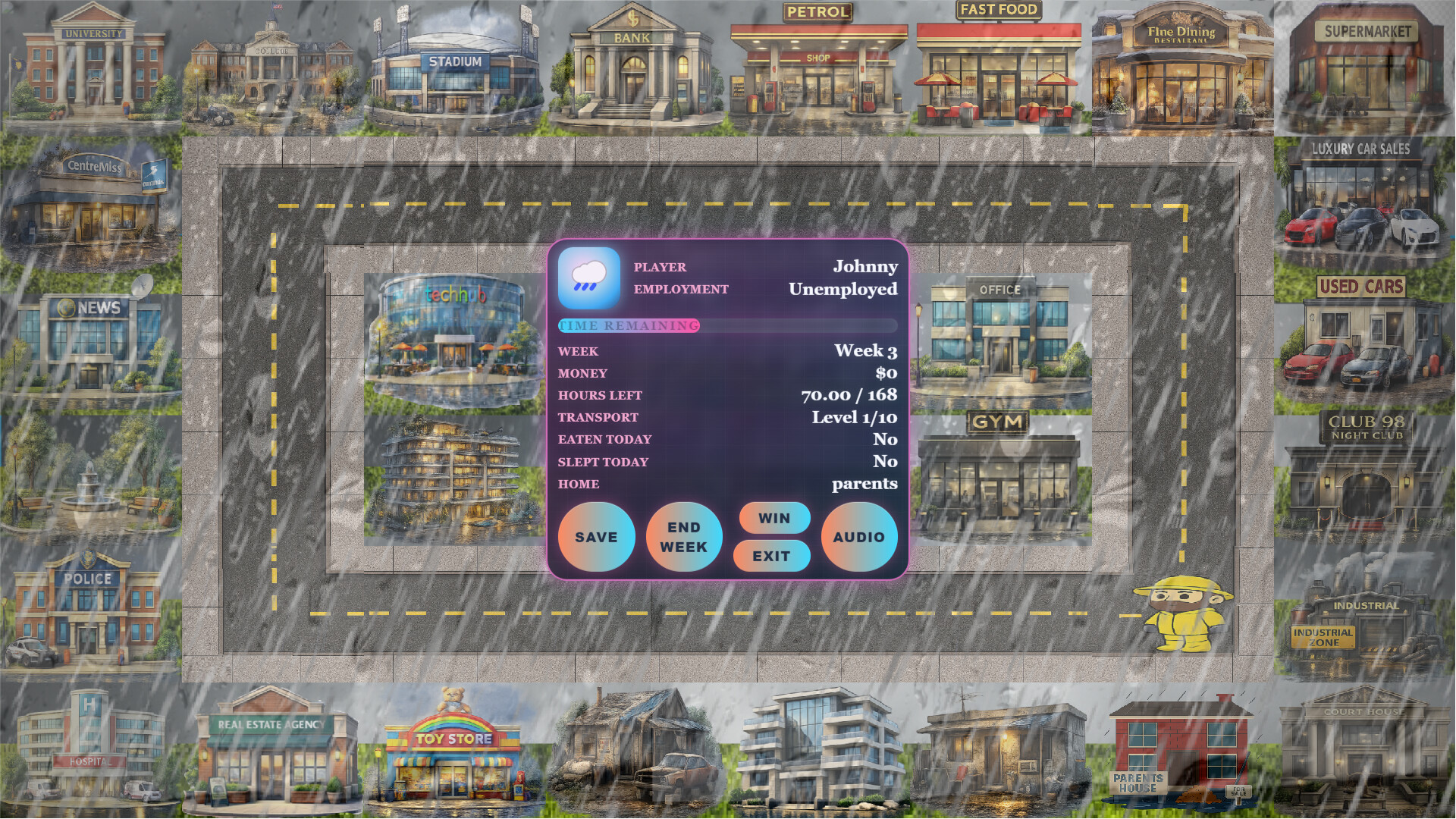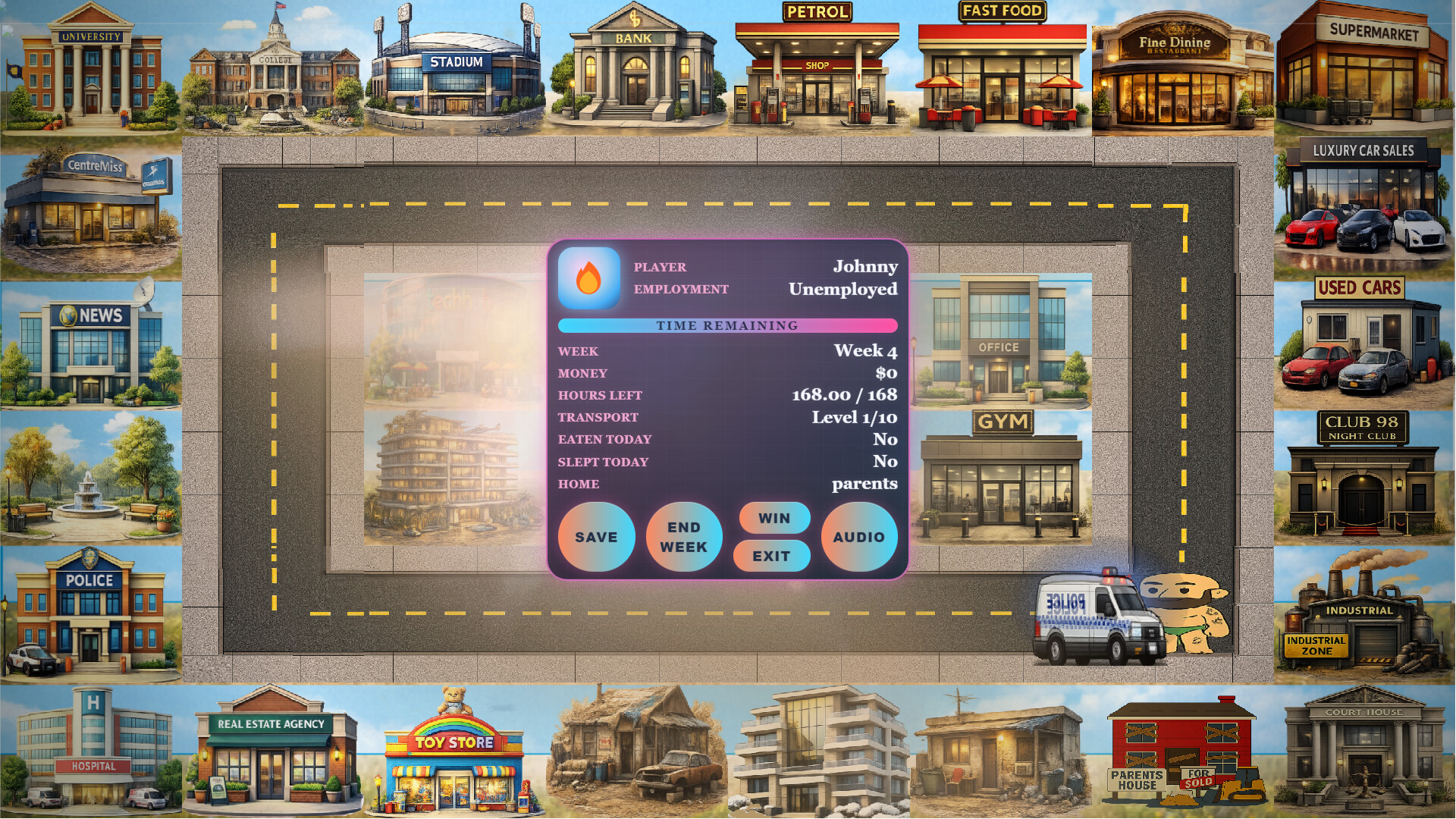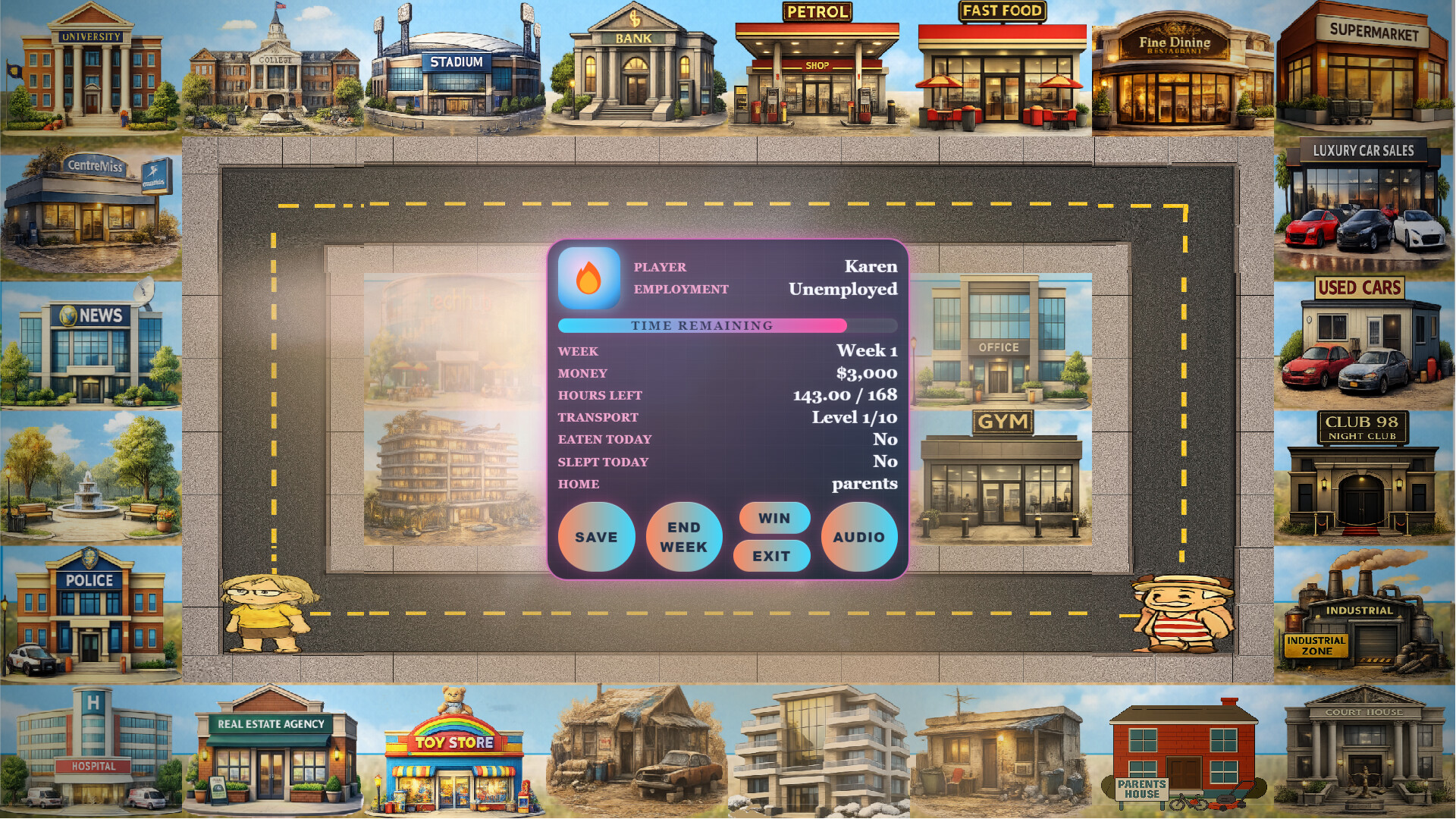 You are dropped into a living system where time, money, and survival are constantly working against you.