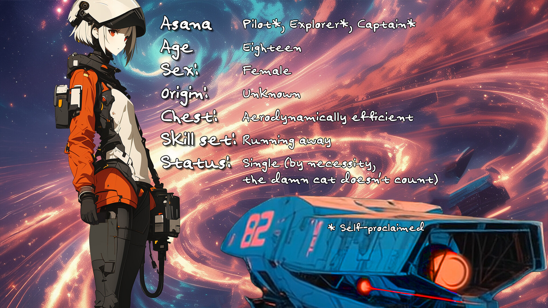 You are Captain Asana. Planets keep exploding in your rearview mirror, heavily armed Cat-Ptain Paradox is hunting you down, and nobody will tell you why. Build your character. Make your choices. Try not to make things worse.