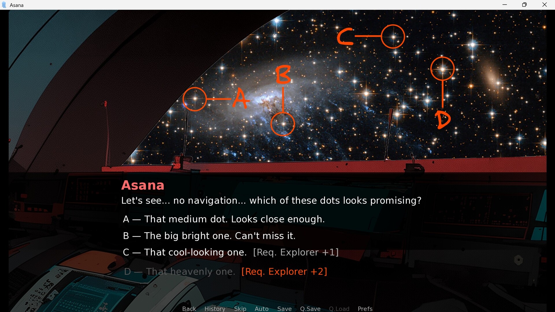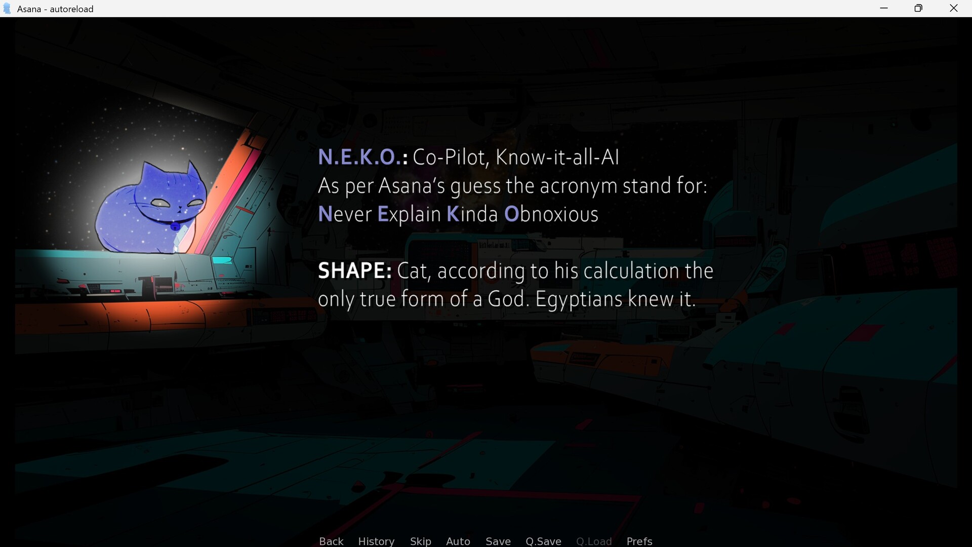 ASANA is a sci-fi dark comedy visual novel where your choices shape your character, your stats shape your options, and N.E.K.O. — the ship's godlike AI, currently in cat form, permanently in judgment mode — watches everything and is not impressed.