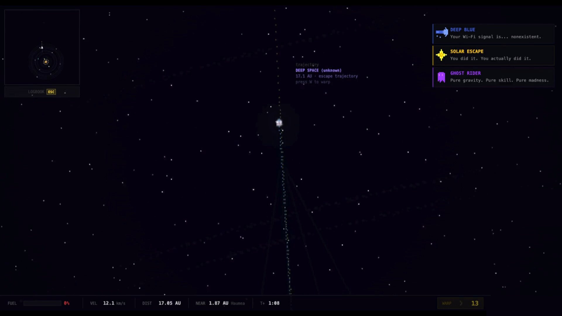 Escaping the solar system is just the beginning. Beyond the Sun's gravity well lies a map of reachable stars — Proxima Centauri, Barnard's Star, Sirius, and more. Each one is a different challenge, a different route, a different song. Some you'll stumble into. Others will take every tech upgrade, every trick, and every ounce of patience you've built up.