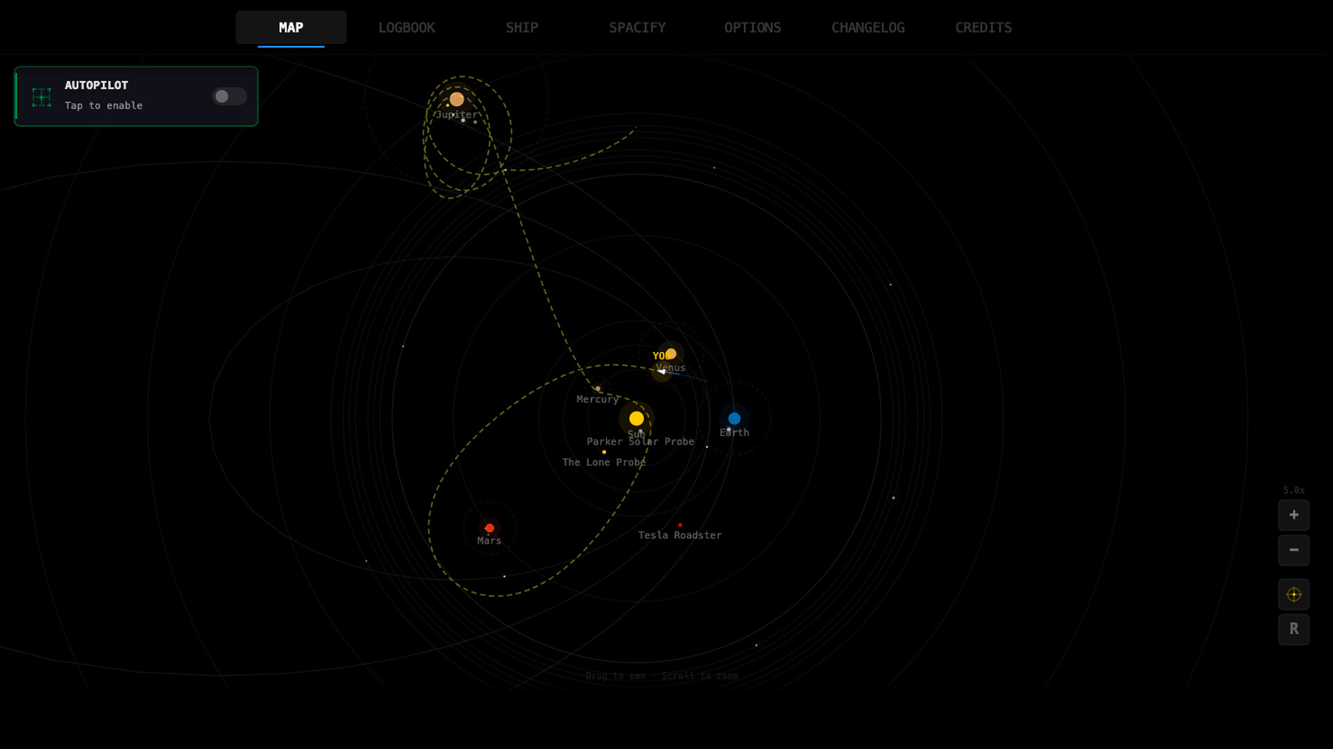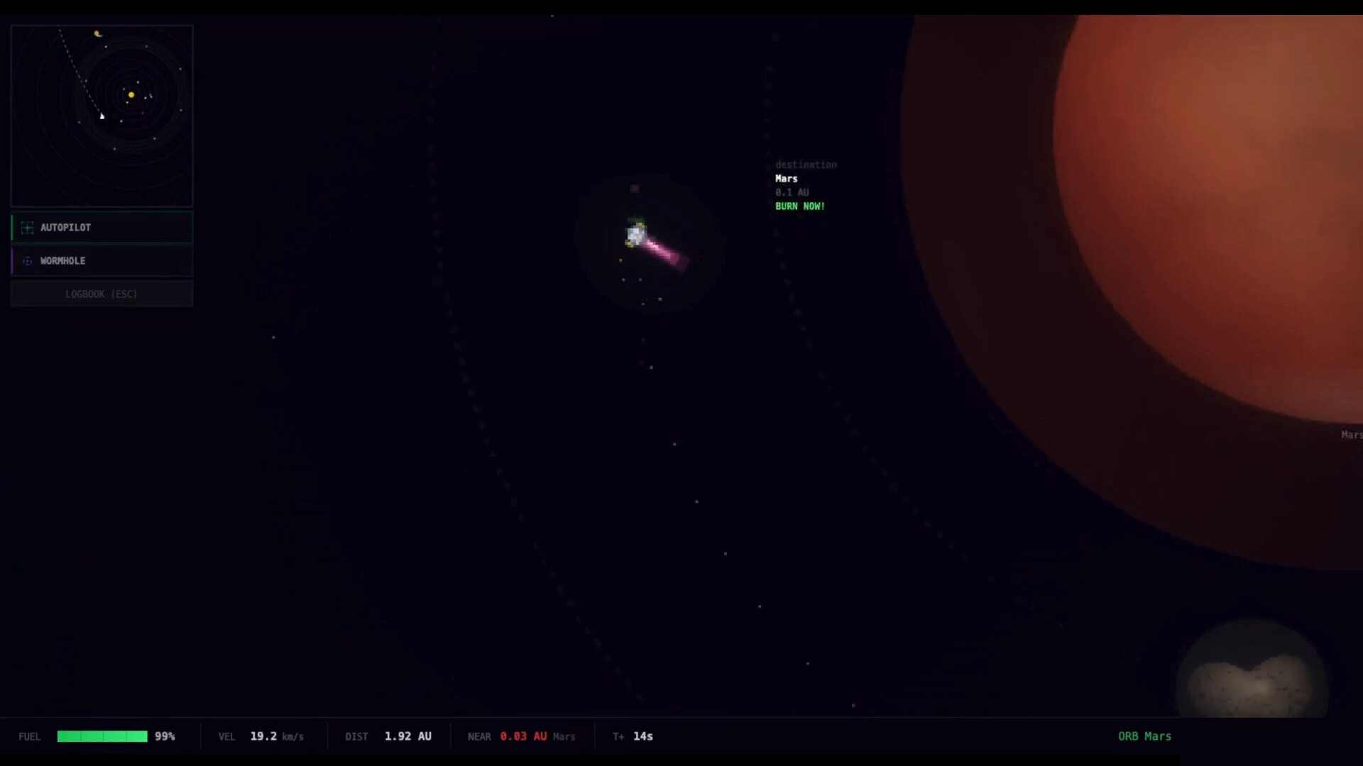 Launch from Earth. Burn to break the atmosphere. Then the solar system opens up. Mercury hugs the Sun, Venus waits patiently, Mars will throw you outward if you time it right, and Jupiter's gravity well is either your salvation or your grave.