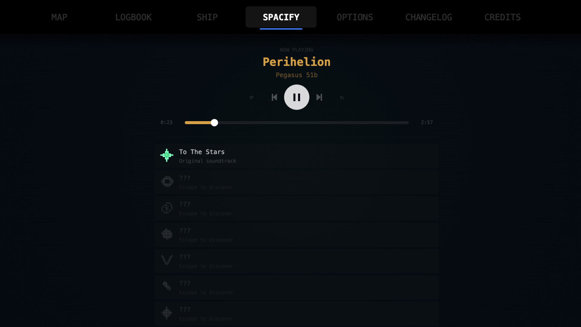 The logbook tracks where you've been. The Spacify player remembers every soundtrack you've unlocked. Your ranks, achievements, and fastest escape times persist across every run.
