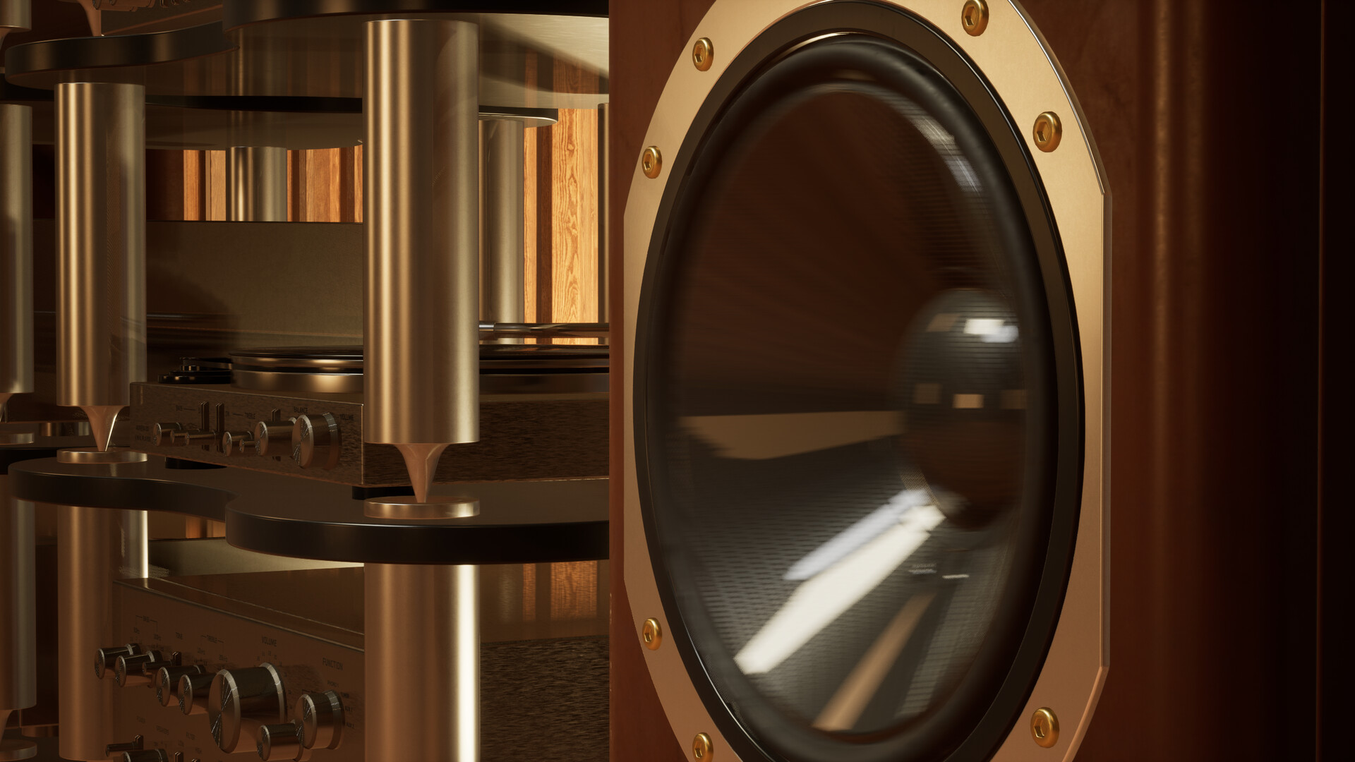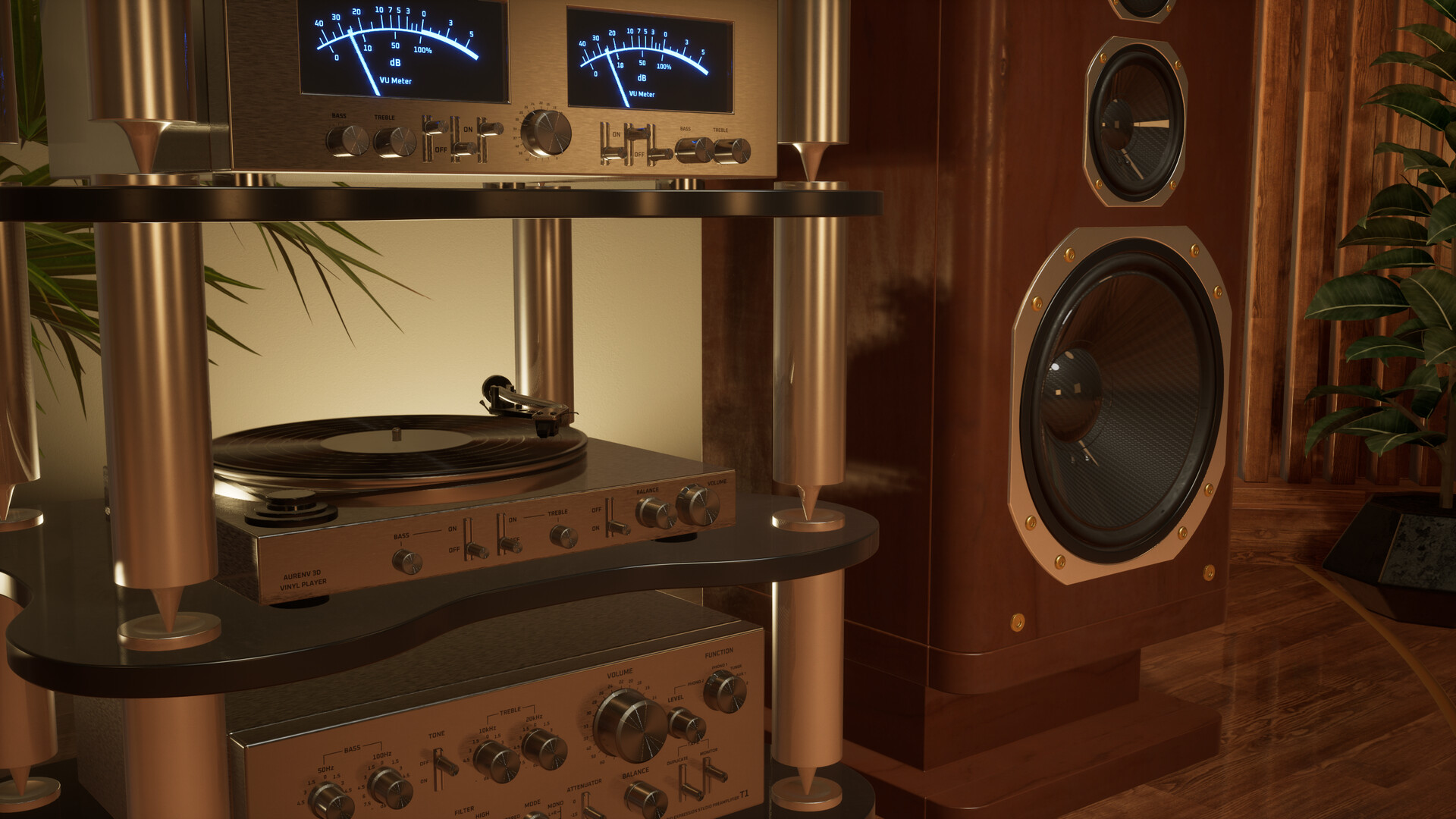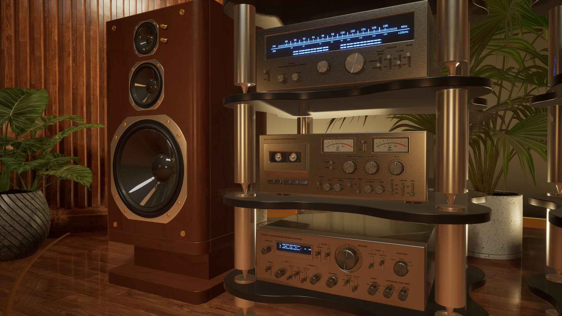 Aurenv uses the audio signal that is going through the Default Playback Device of your Windows to animate various elements within 3D environments such as speaker drivers, vu meters, lights and more.
