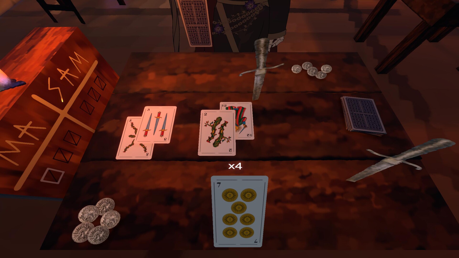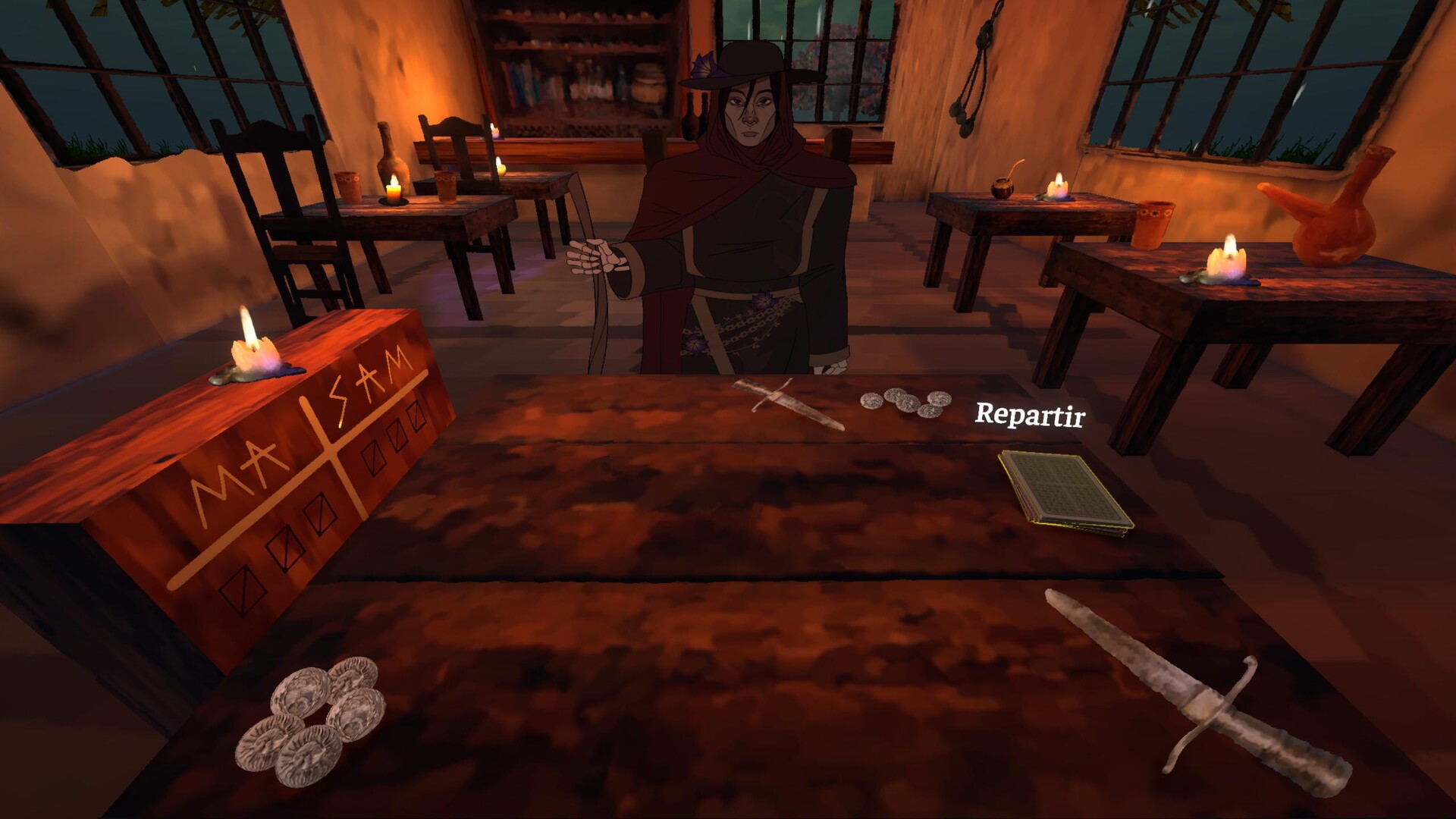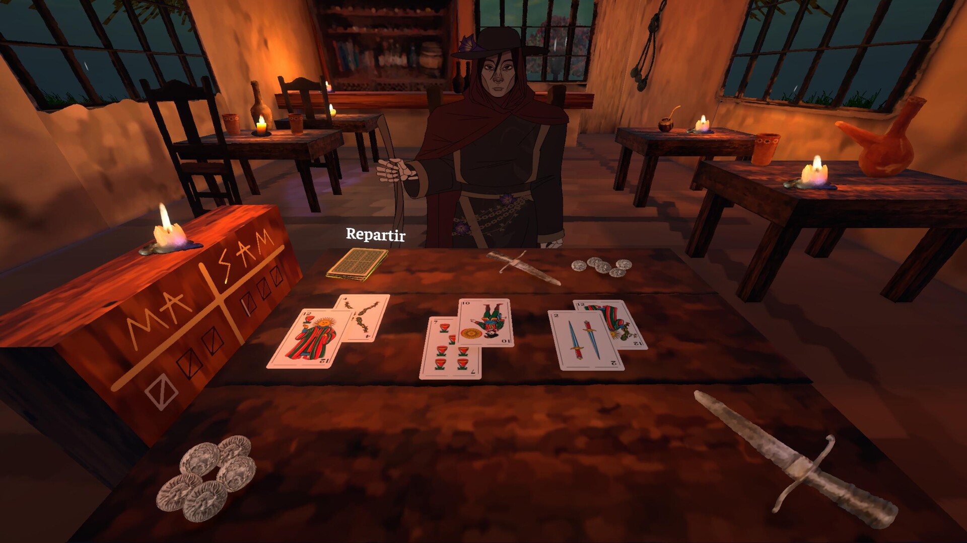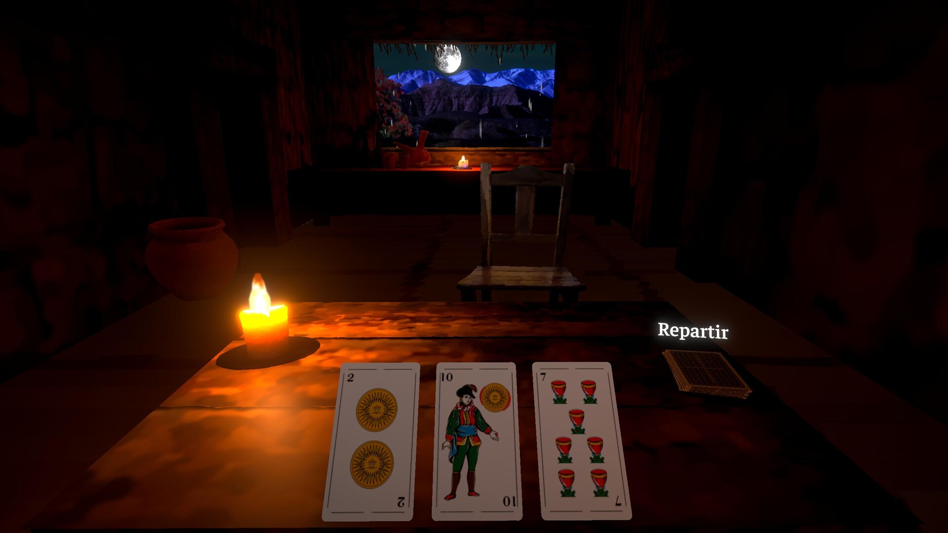 You play as Martina Chapanay, a legendary gaucha forced to participate in a Truco tournament organized by San La Muerte. In this challenge, each match is a duel of strategy and deception: the winner is granted a wish, while the loser loses their soul.