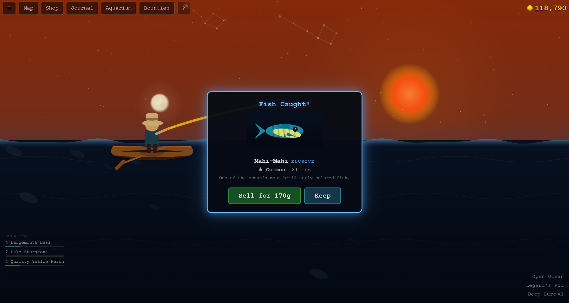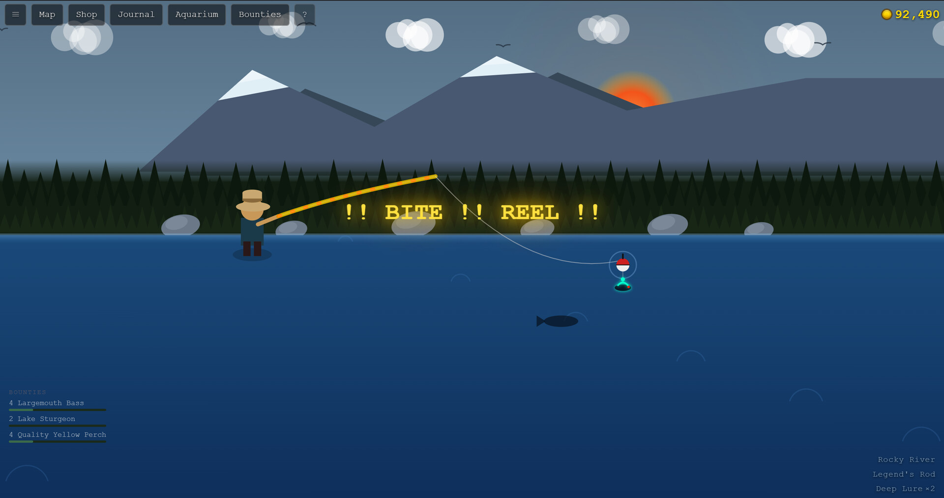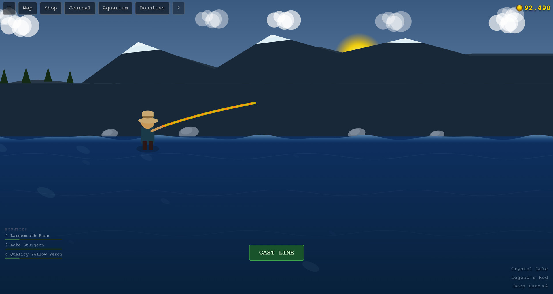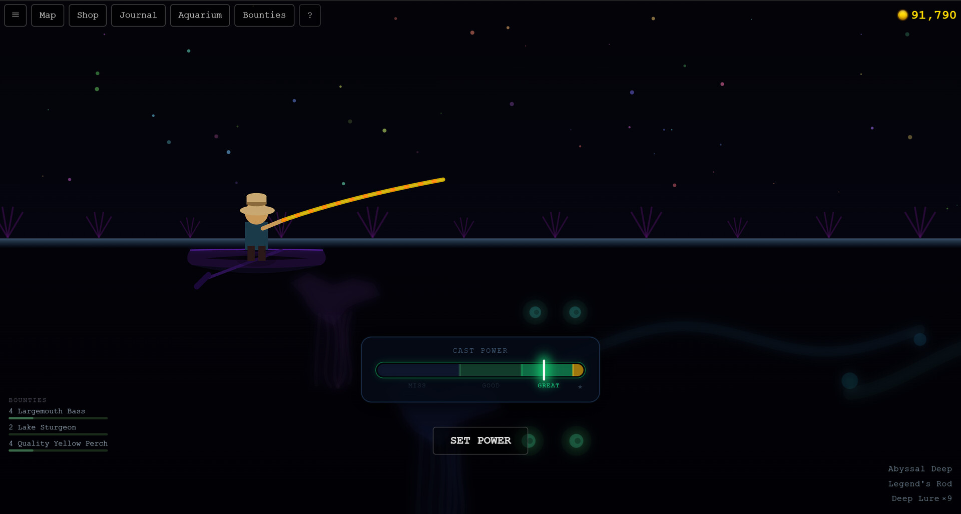 Seven rods, five baits, each unlocking new zones and shifting the odds in your favor. The Legend's Rod sharpens your sense for rare fish. The Eternal Rod guarantees trophy quality on every catch... if you can afford it.