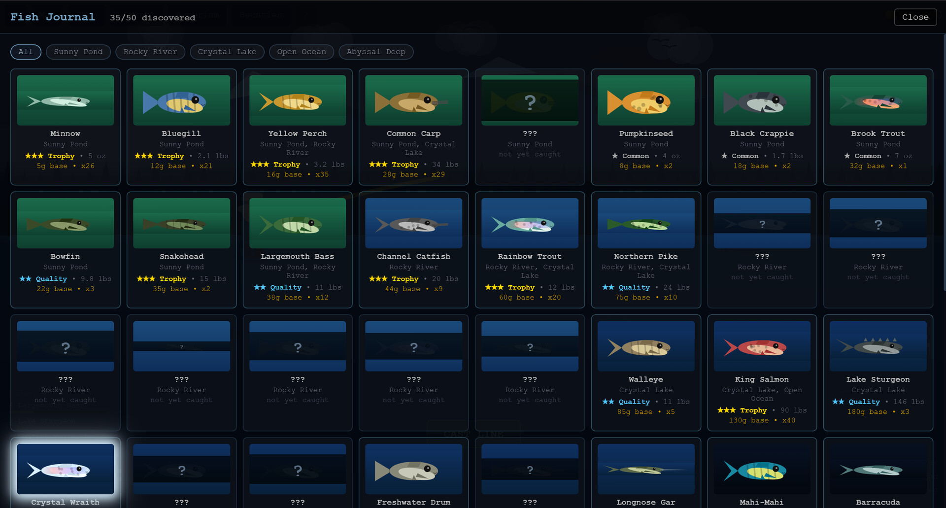 From humble minnows and bluegill to the ultra-rare Void Drake, every cast is a roll of the dice. Build your journal by discovering every species and push for trophy quality on every single one!