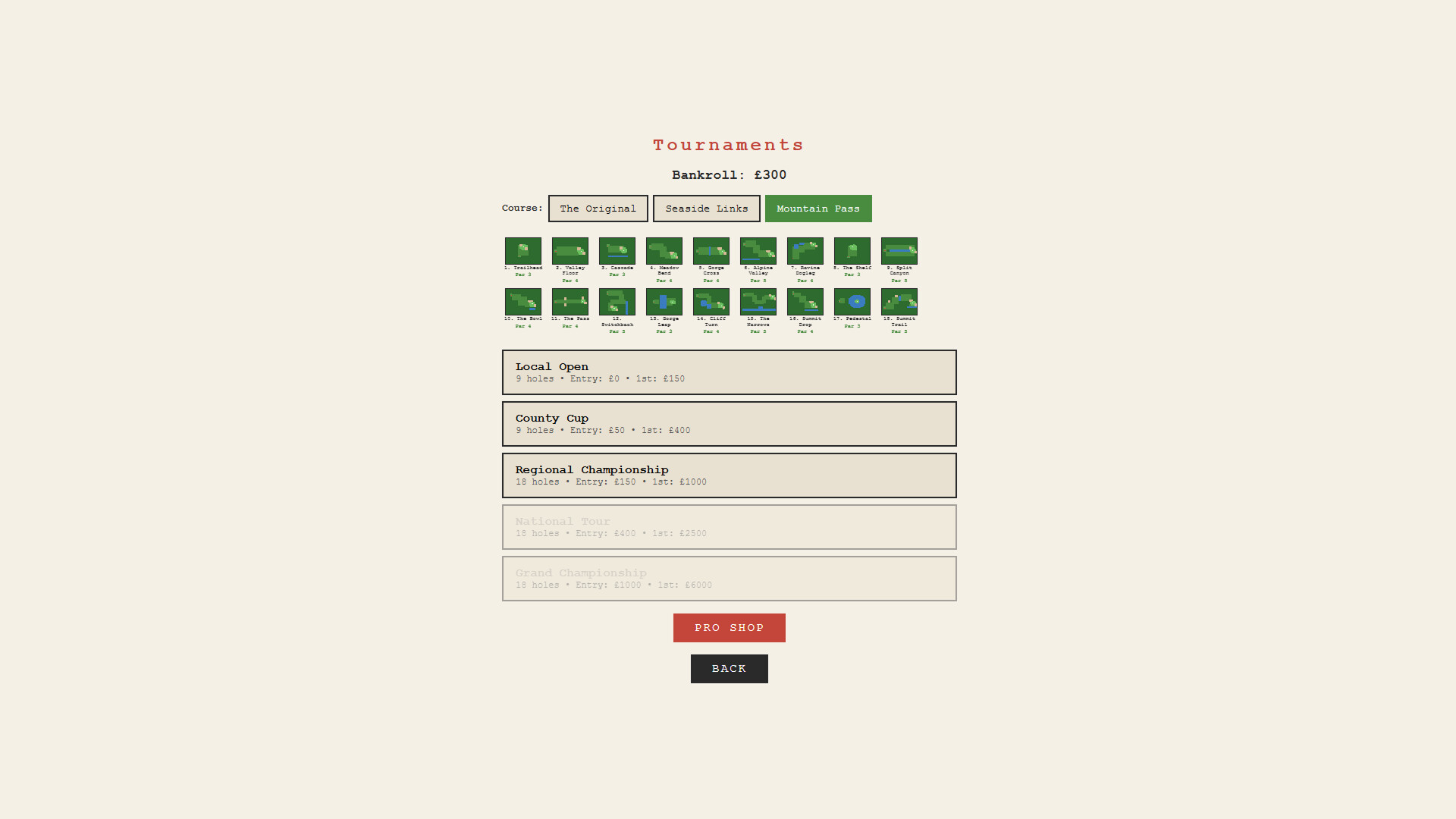 5 tournament tiers from the Local Open (free entry, friendly field) to the Grand Championship (high stakes, elite competition)