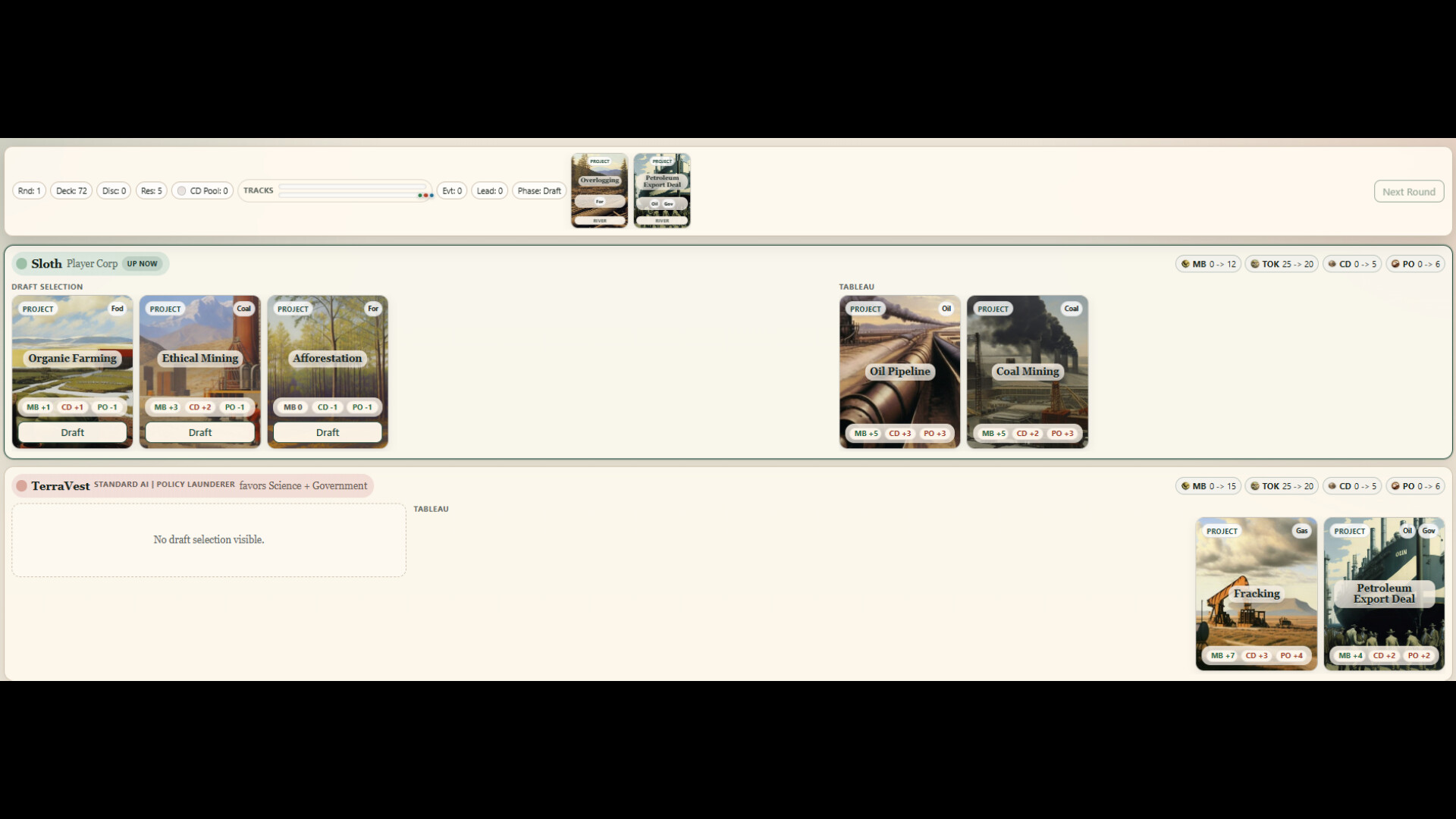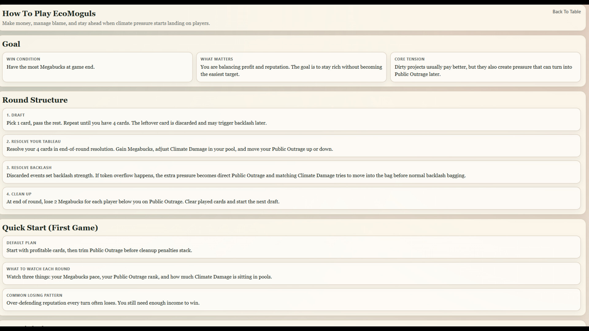 Each round, players draft projects and events into a temporary tableau, collect Megabucks, build local Climate Damage, and fight to avoid becoming the easiest target on the Public Outrage track.