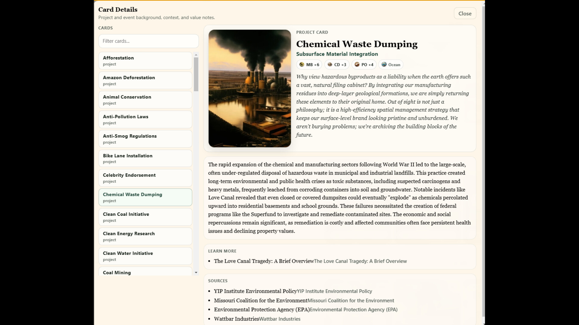 Every card in EcoMoguls pairs polished corporate spin with straight historical context and source material. The tone is sharp, but the subject matter is real.