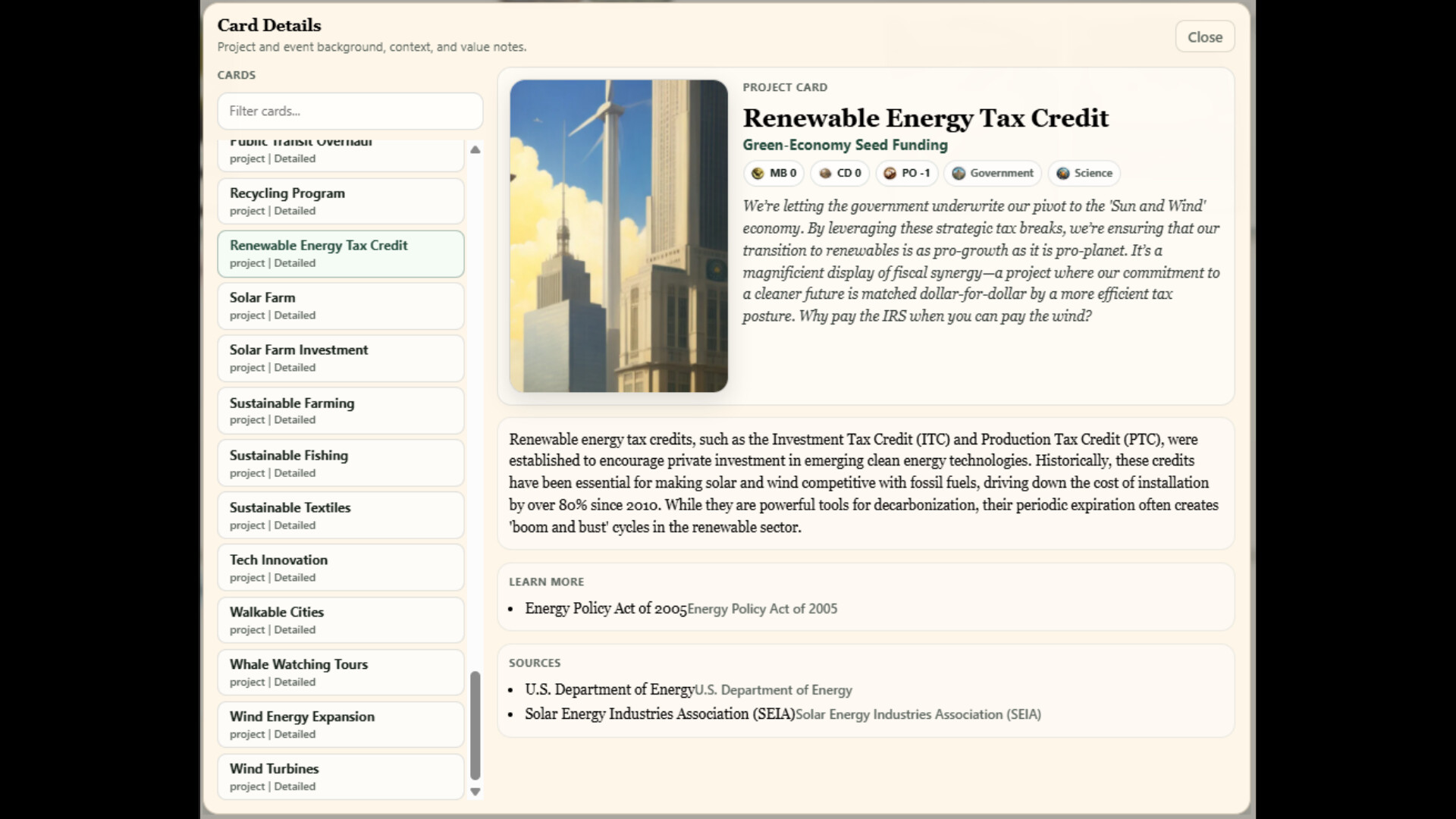 - Inspect full card details with satirical flavor text, historical context, and sources