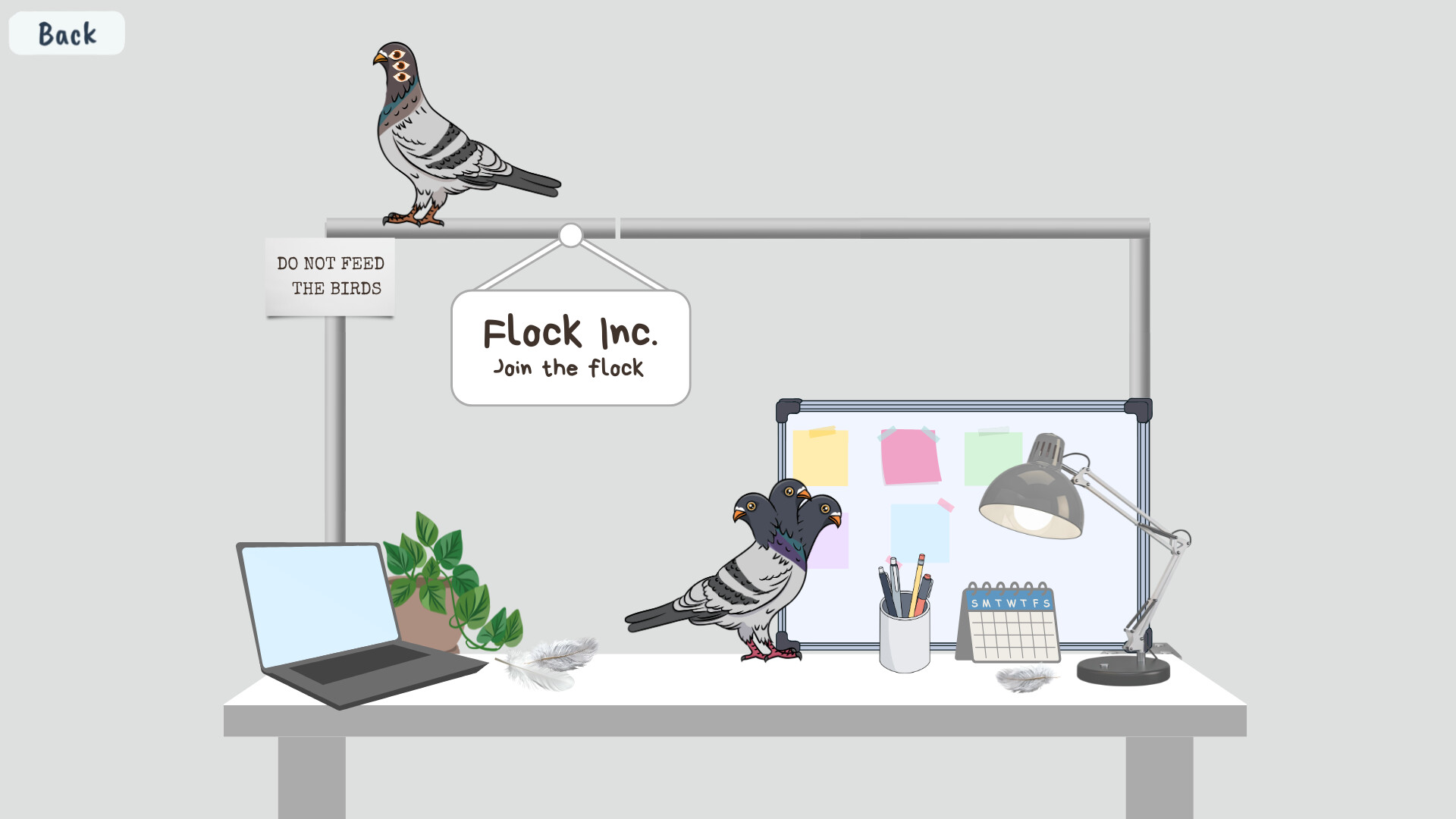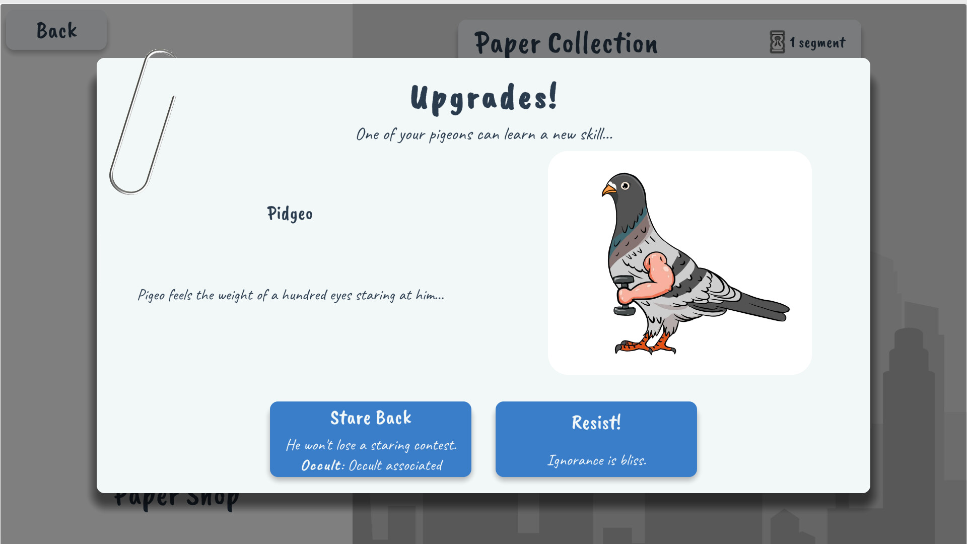 In this satirical management sim, a few crumbs are all it takes to break free and build your own pigeon-powered marketing empire. Recruit pigeons, assign them to advertising campaigns, and manage your coop as your business grows in scale.... and strangeness.