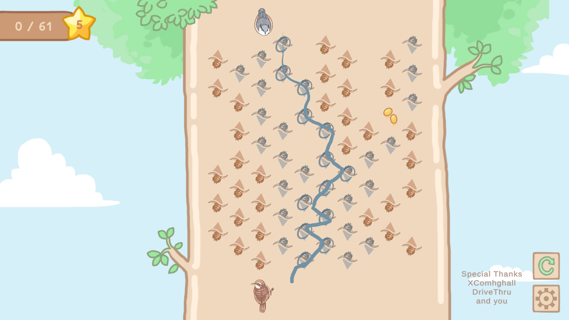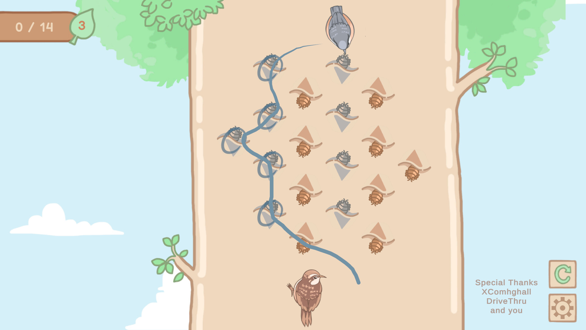 "Birds Eat Bugs" is a relaxing and stress-relieving little game. You freely draw lines to move across hexagonal grids to guide two birds to eat bugs. You will play as two birds climbing trees in opposite directions, find the optimal and shortest path, clearing pests from the tree, and uncovering the concept of "ecological niches".