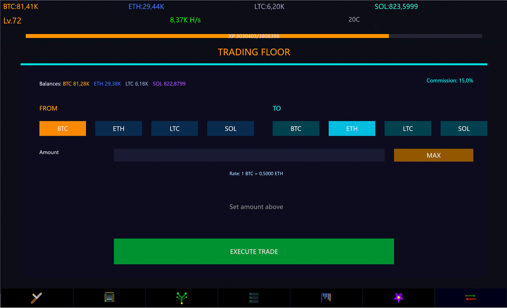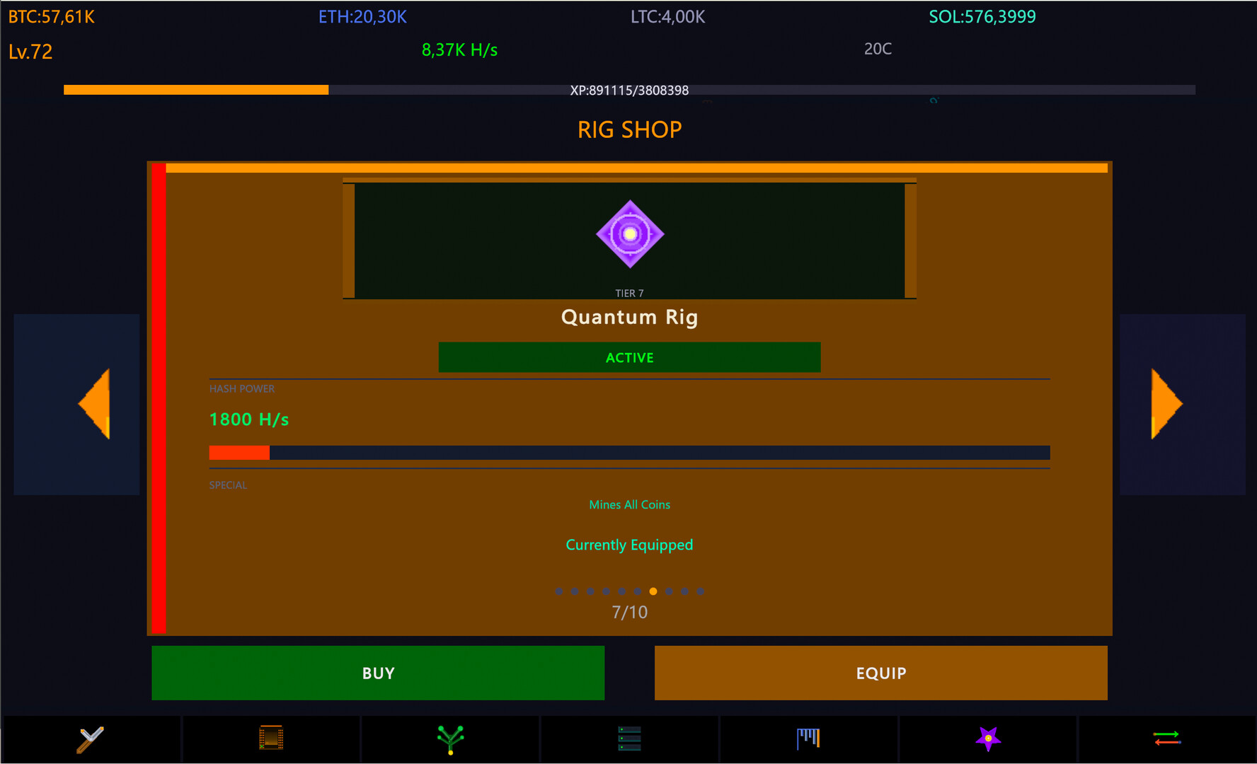 USB 마이너부터 퀀텀 리그까지 10단계 채굴 장비. 각 단계마다 더 많은 해시 파워와 고유 보너스가 해금됩니다.