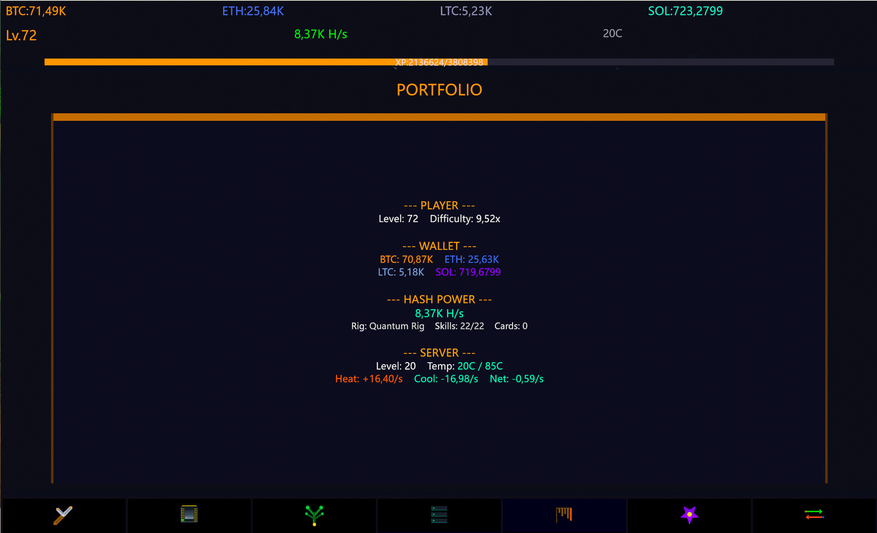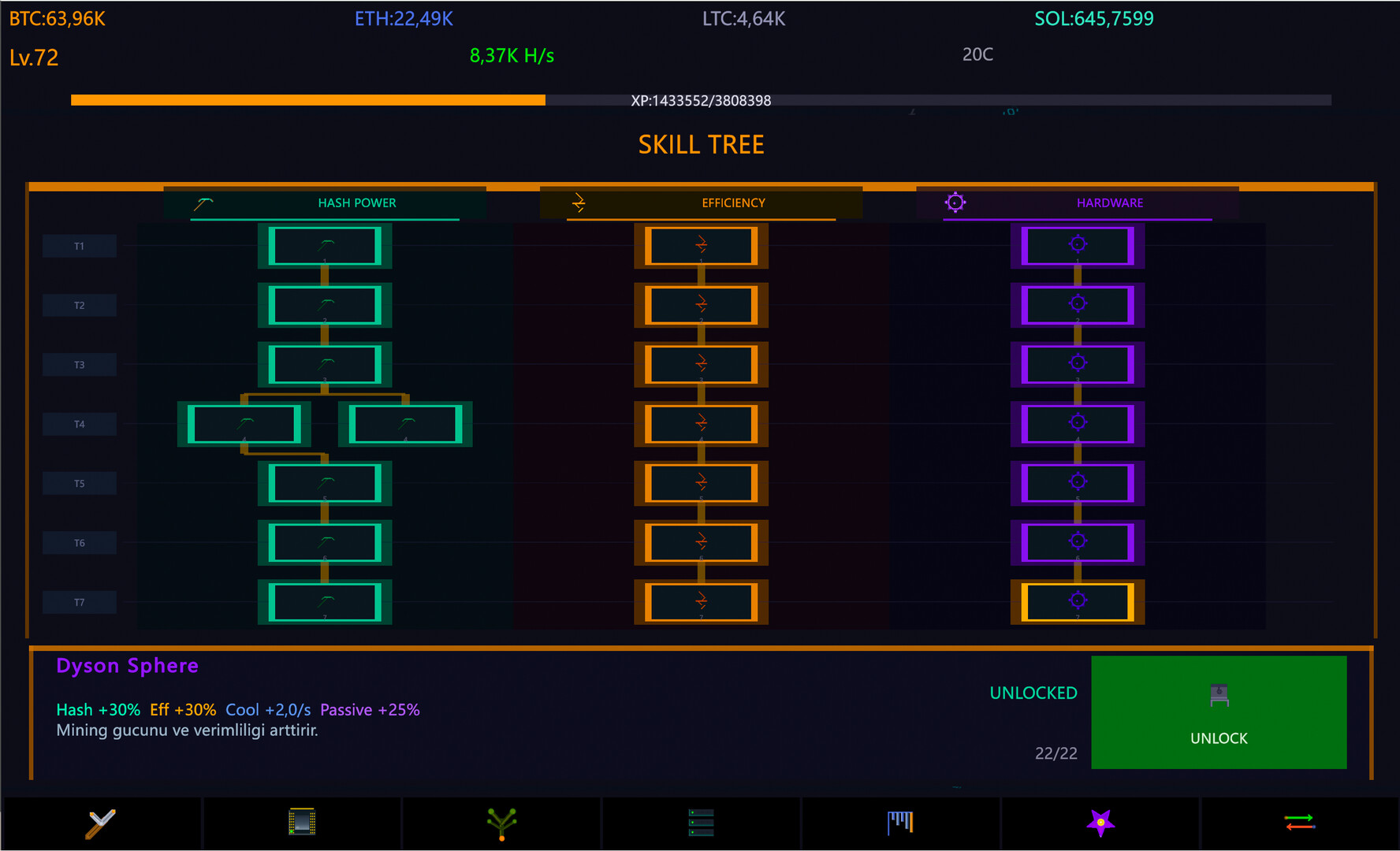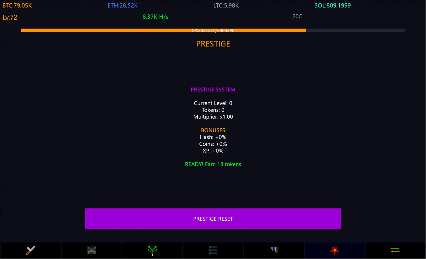 세 가지 분기: 해시 파워, 효율성, 하드웨어. Tier 1부터 Tier 7까지 22개의 업그레이드 가능한 노드. 매 프레스티지마다 다른 전략을 시도하세요.