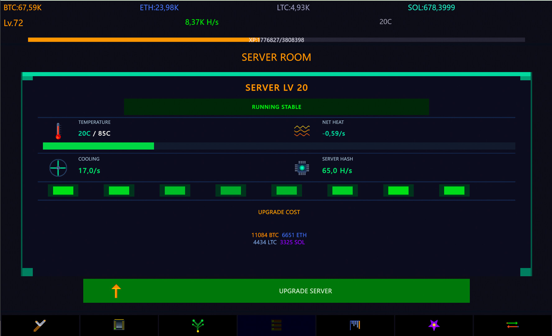 채굴기를 30초간 ×1.2 속도 버스트로 밀어붙이세요. 배율을 쌓으세요. 서버실의 온도가 올라가는 것을 느끼세요.