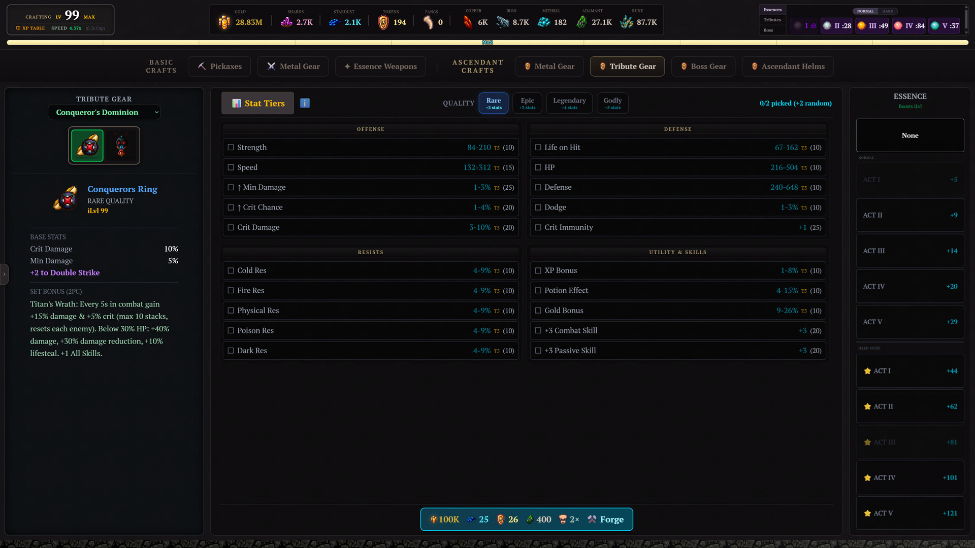 Use our built-in Gear Optimizer to customize your build exactly how you want it. Input your own custom stat weights, and let the algorithm suggest the exact gear combinations needed to maximize your Time To Kill (TTK), Gold Per Hour, XP, or any other custom parameters you set.