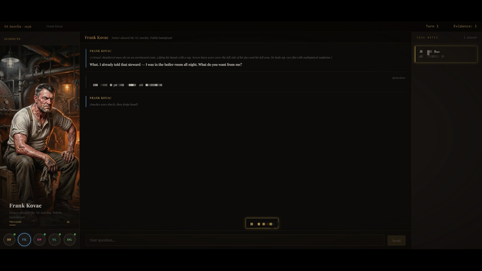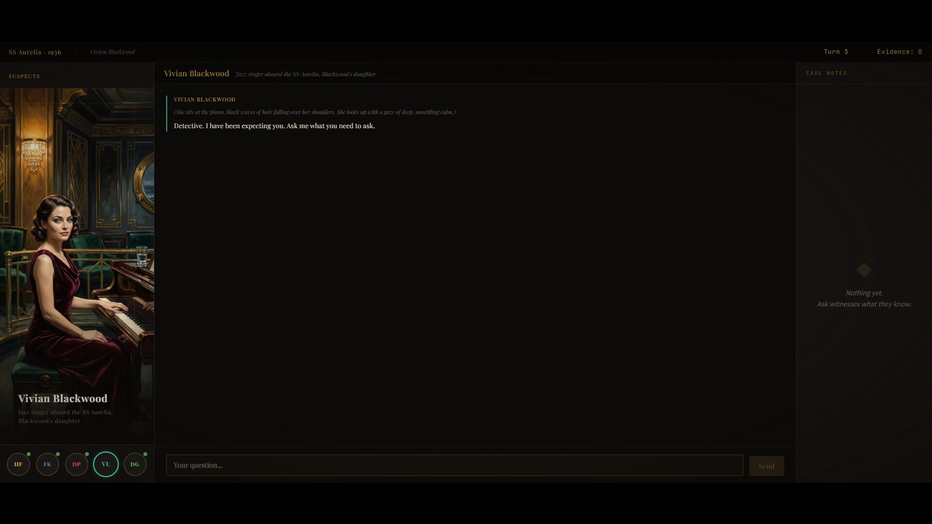 Talk to anyone. Ask anything. Every suspect is powered by AI — they remember every word you've said, they'll deflect, contradict themselves, and unravel under pressure in real time. No dialogue options. No scripted paths. Every conversation is unique.