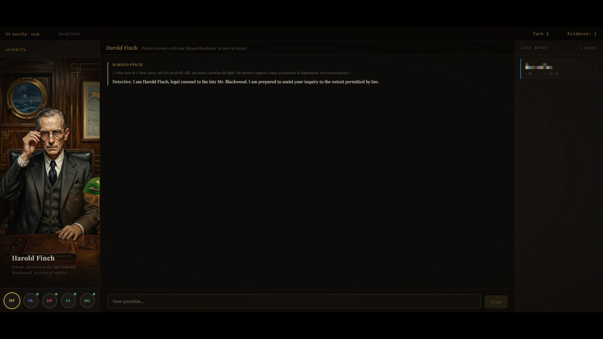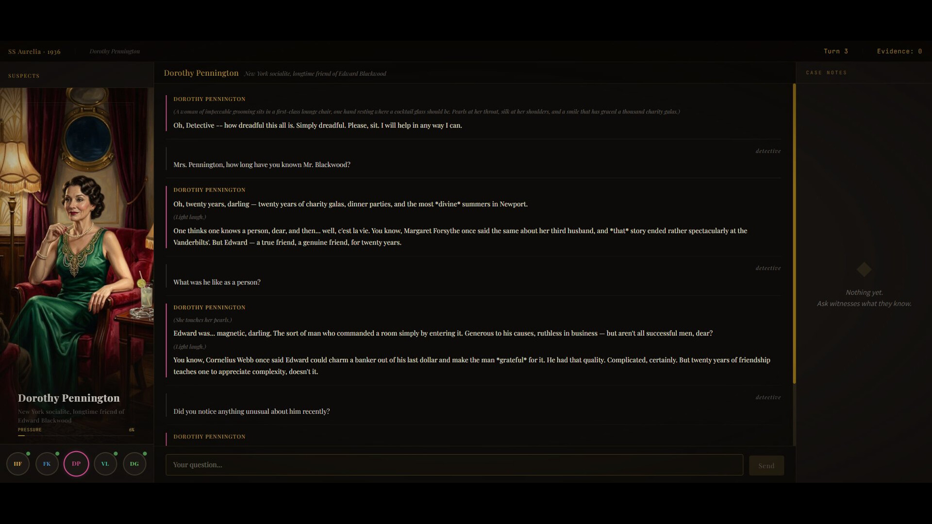 Your detective's license grants passage for four complete investigations of the Blackwood case — four chances to approach the truth from different angles, four chances to press harder, four chances to fail. Each voyage ends when you submit your final report, and the file is sealed forever. Whatever you missed — every secret almost told, every moment you didn't push far enough — will be waiting for you in the archive.