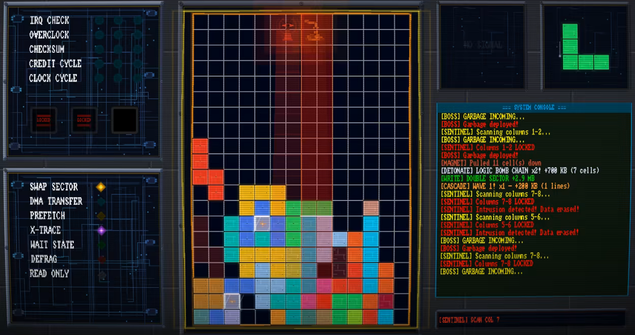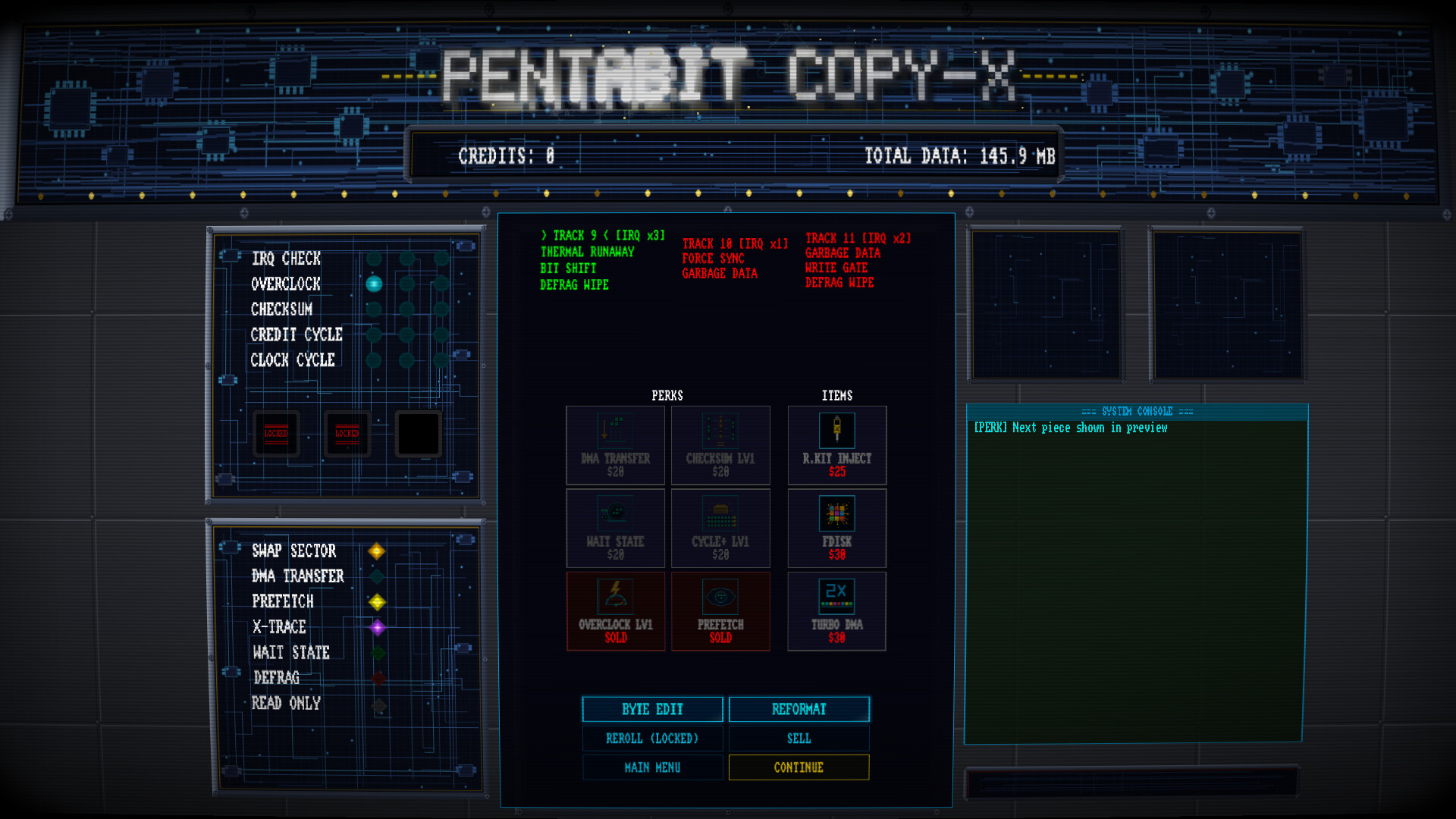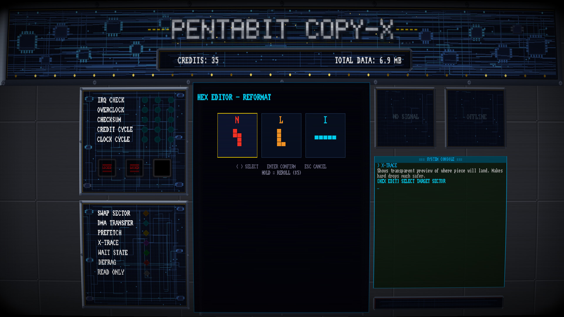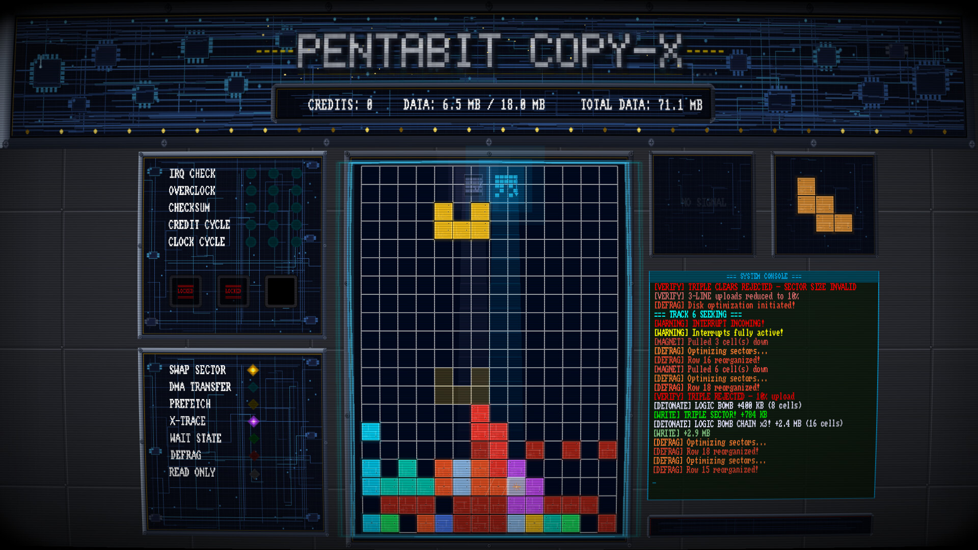 Pentabit Copy-X is a puzzle game with roguelike elements. Each run has 12 tracks and a final event to clear. If things get too difficult, there are permanent hardware upgrades which will help you save your data.