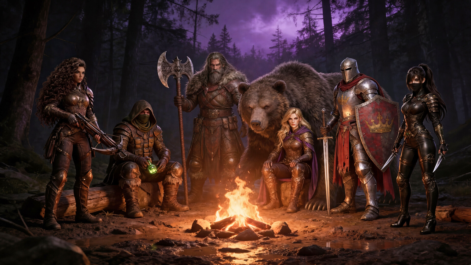 숲의 파수꾼 엘린드라 (Elyndra)*: 탄도학적 정밀함과 생물학적 선봉장. 고장력 활을 이용한 원거리 사격 전문가로, 거리를 유지하며 전장을 지배합니다. 그녀는 전투곰 '아크토스(Arctos)'의 전술적 지원을 받으며, 아크토스가 살아있는 벽이 되어주는 동안 적의 약점을 파악해 제거합니다.