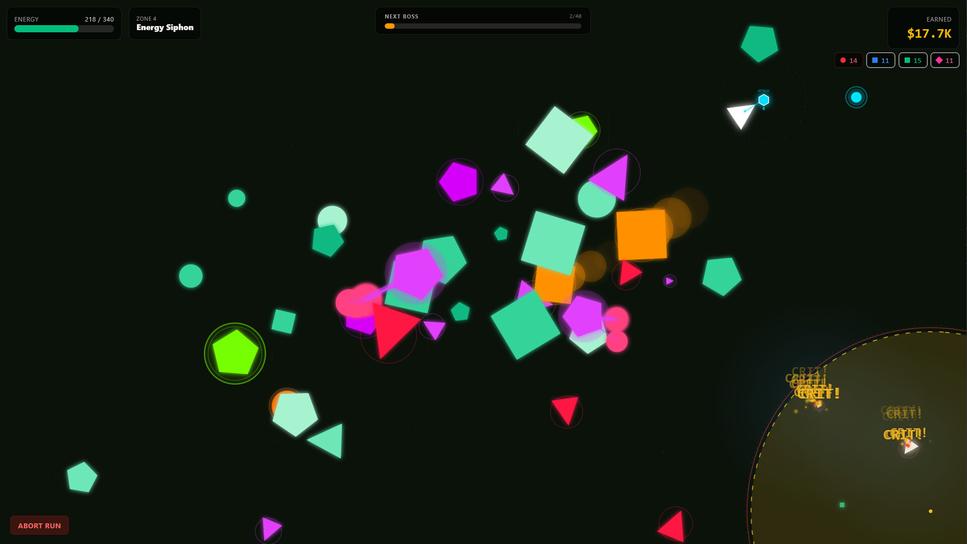 Shapes drift. Your cursor destroys. Energy runs out. Spend everything you earned and go again