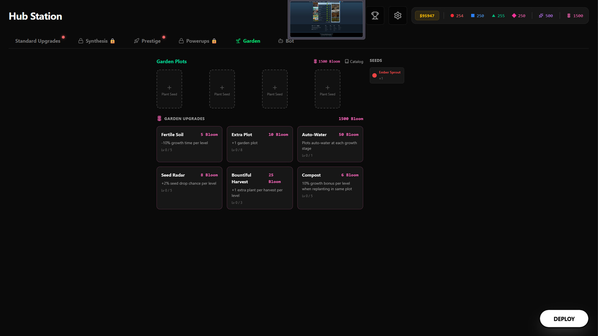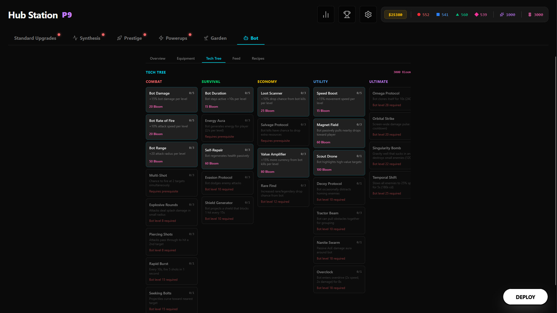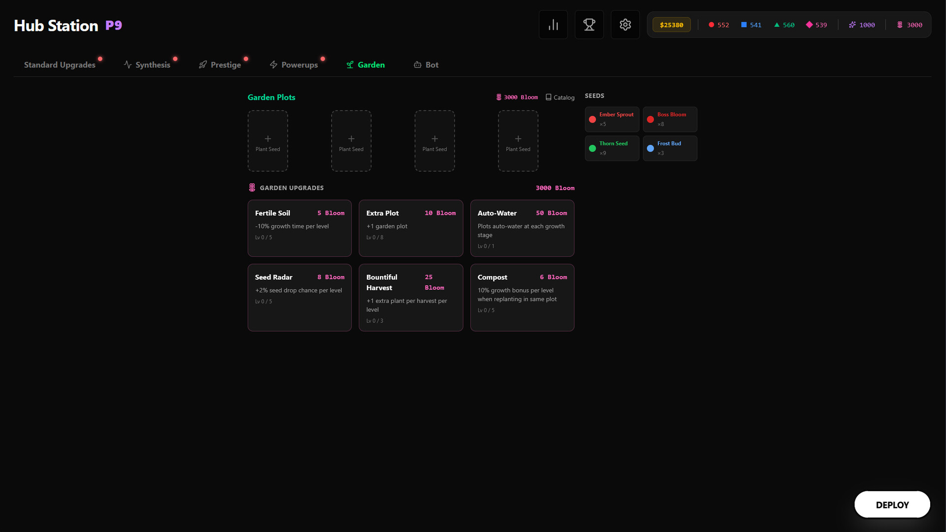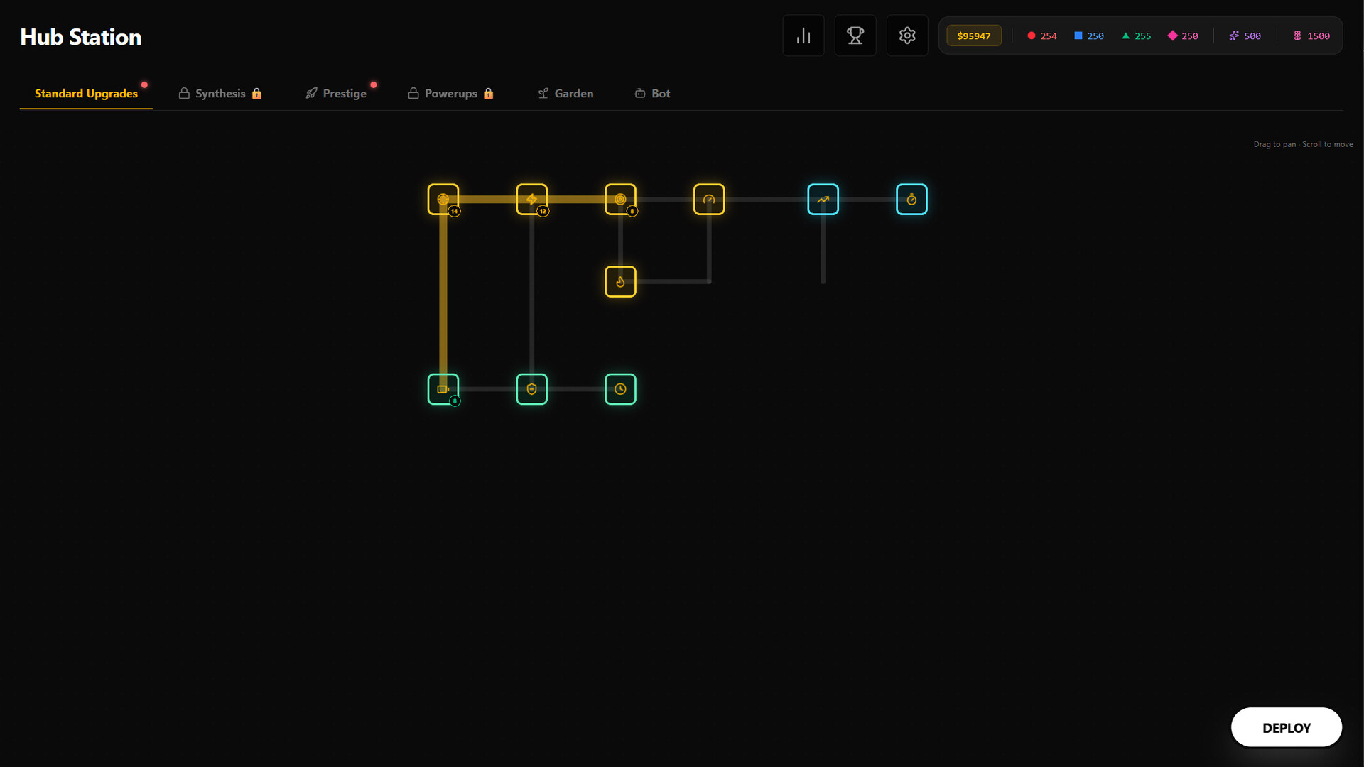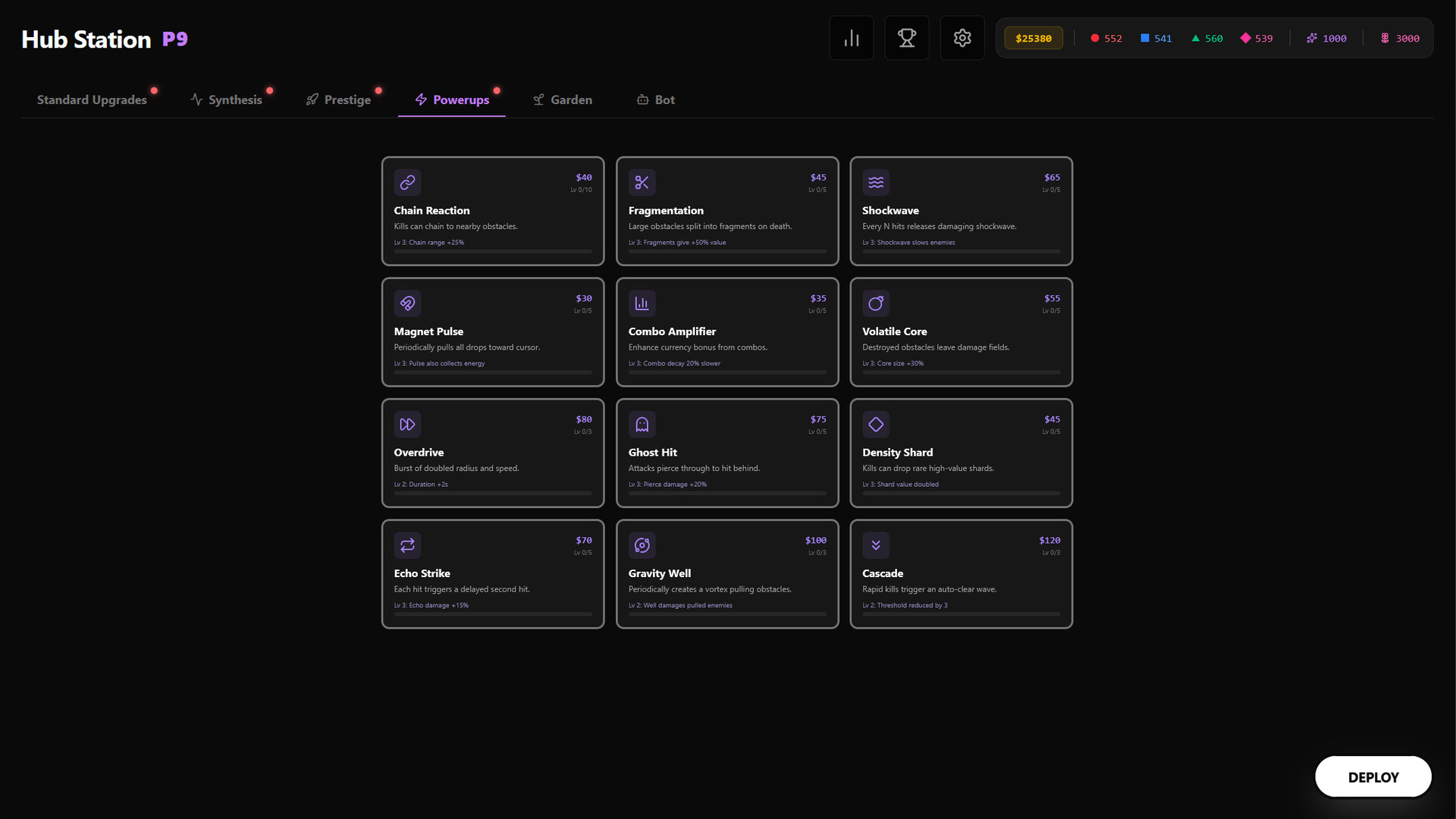 Back in the Hub, you spend. Standard upgrades make you stronger. Synthesis upgrades make you play differently. Prestige upgrades make your next run feel like a different game entirely.