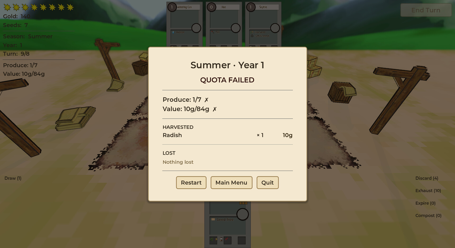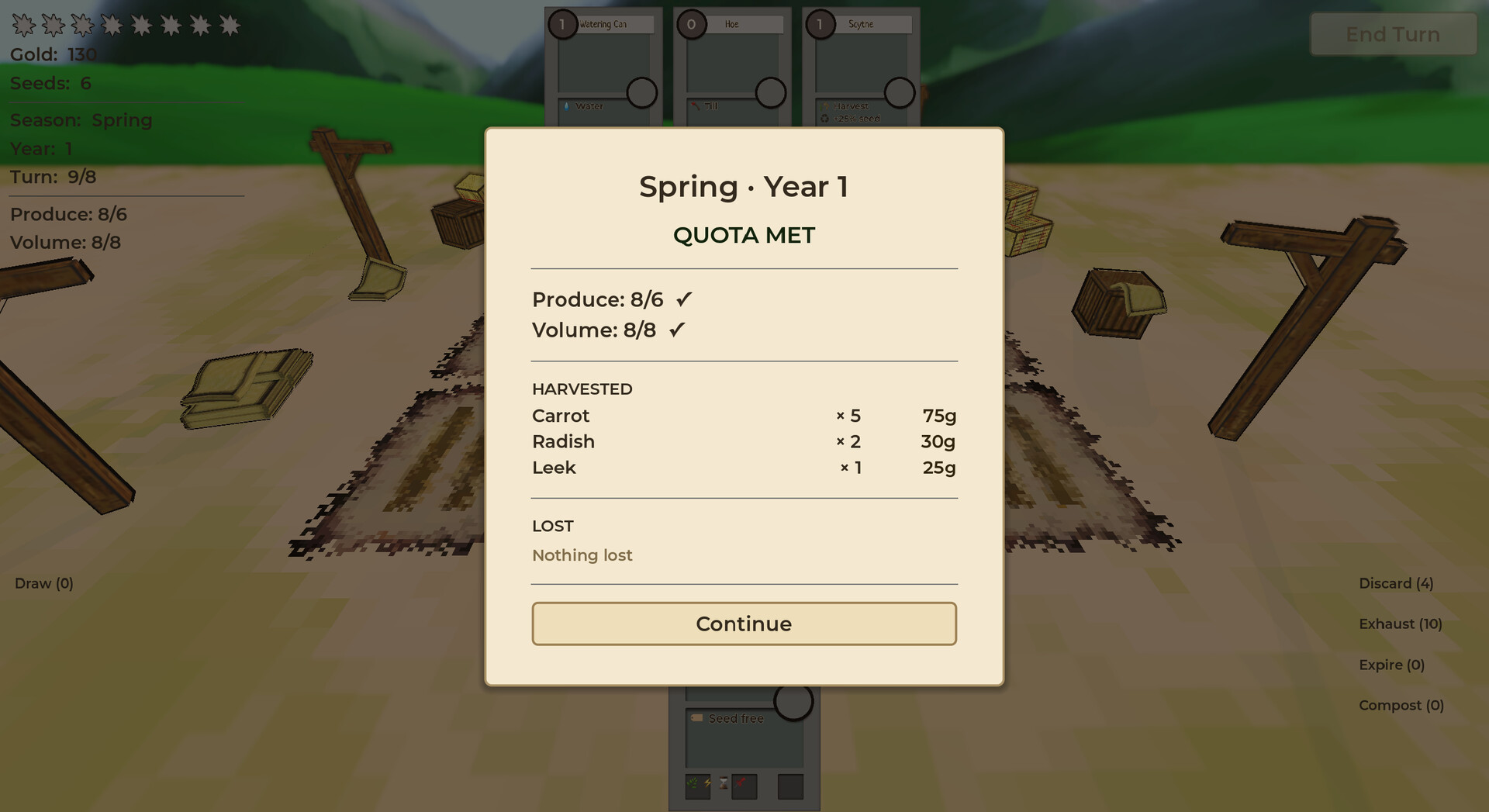Grow / Tend / Reap is a farming deckbuilder where your farm IS your deck. Plan your planting. Survive overnight events that degrade everything you've built. Sell last season's seeds before the next begins.