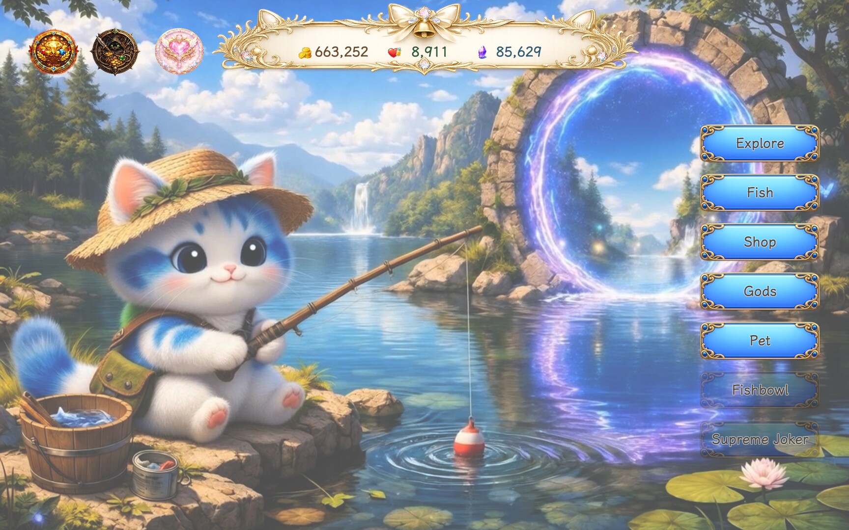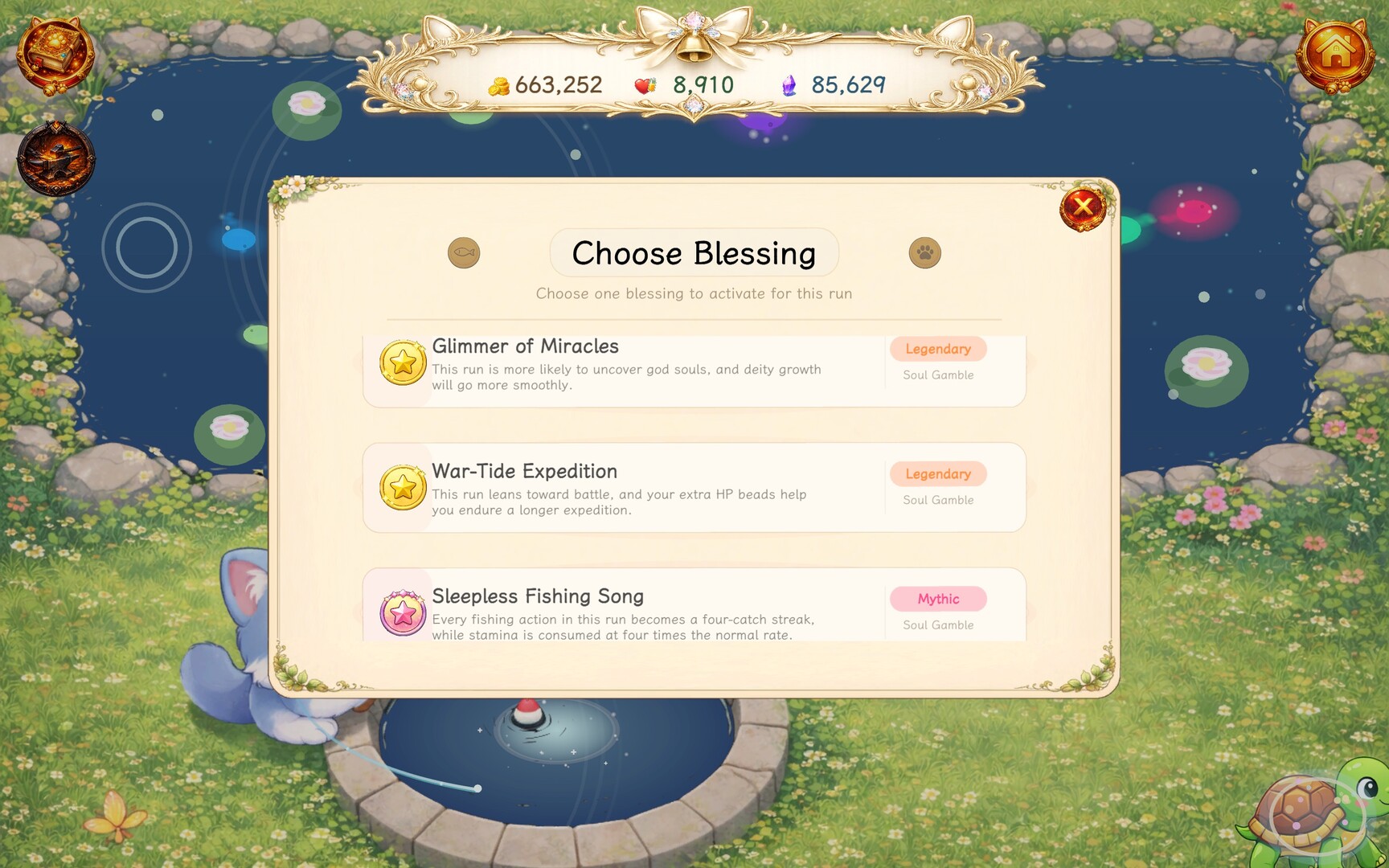 Here, you can fish up adorable and mysterious enchanted fish, travel together with your pet companions, and set off on gentle but ever-changing adventures. Along the way, you will gather resources, meet unusual visitors, receive blessings from gods, shape your build, and slowly grow a little team that feels truly your own.