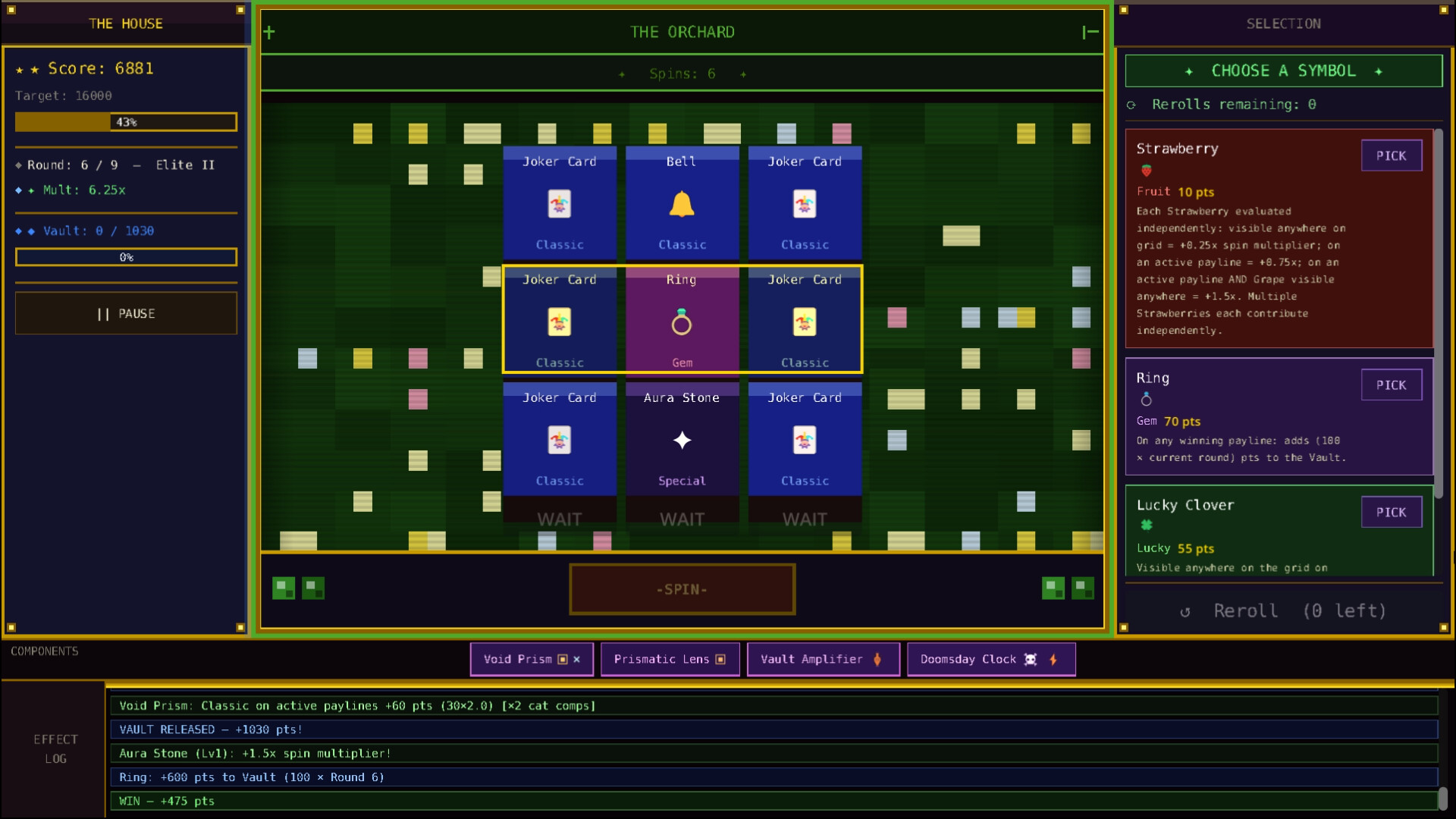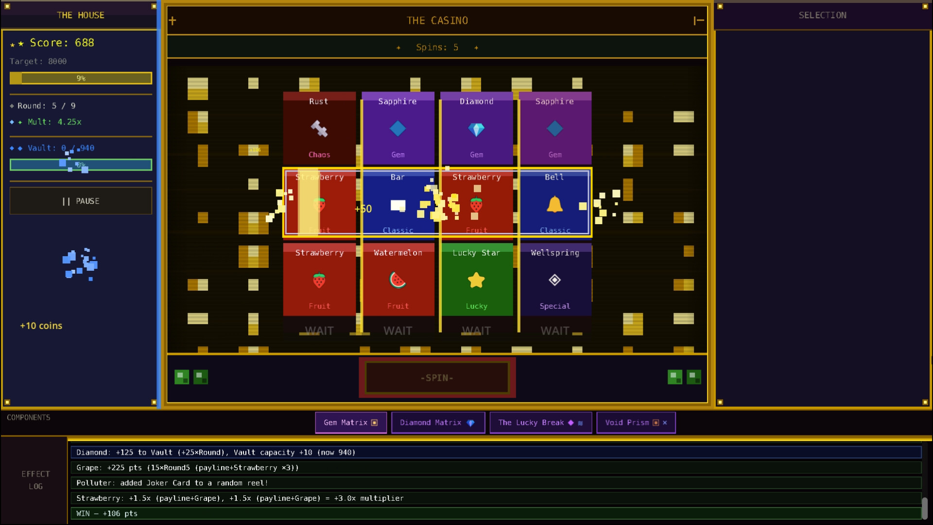 Back-Room Components Between rounds, install components that change how your machine fundamentally operates. Amplify specific symbols, warp payout calculations, and create synergies that stack in ways the casino inspectors definitely didn't approve. With dozens of components available, no two runs ever play the same way.