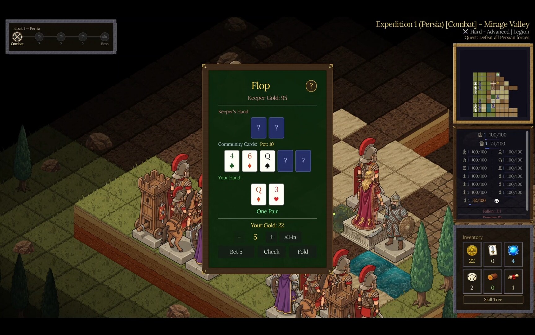 Over 10 interactive NPCs with their own games: Poker, Blackjack, Three-Card Poker, Liar's Dice, Cee-lo, scratch cards, coin flips, bounty boards, a crafting table, and a Colosseum arena challenge. Your King is the only piece who can talk to them — protect him at all costs.